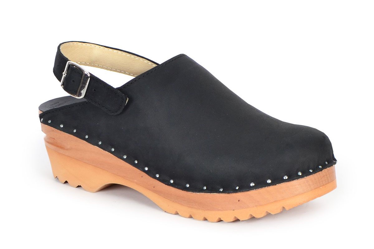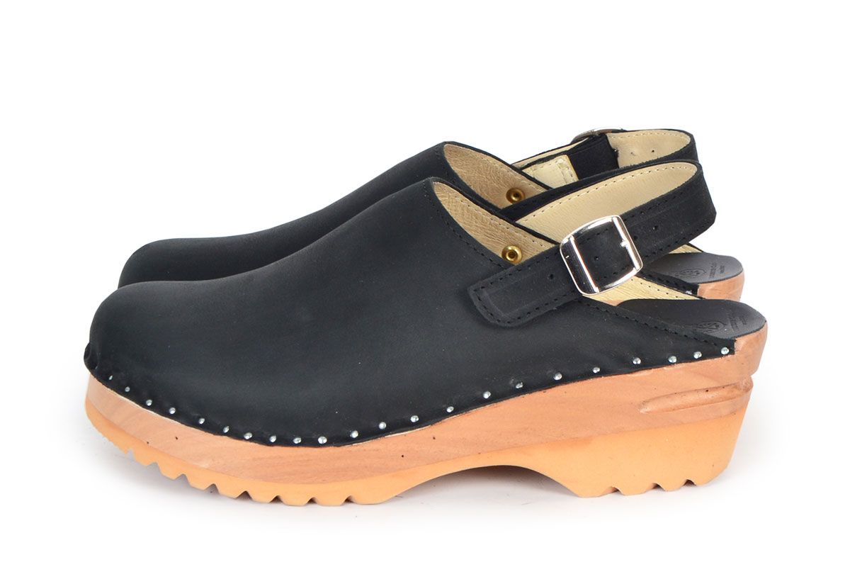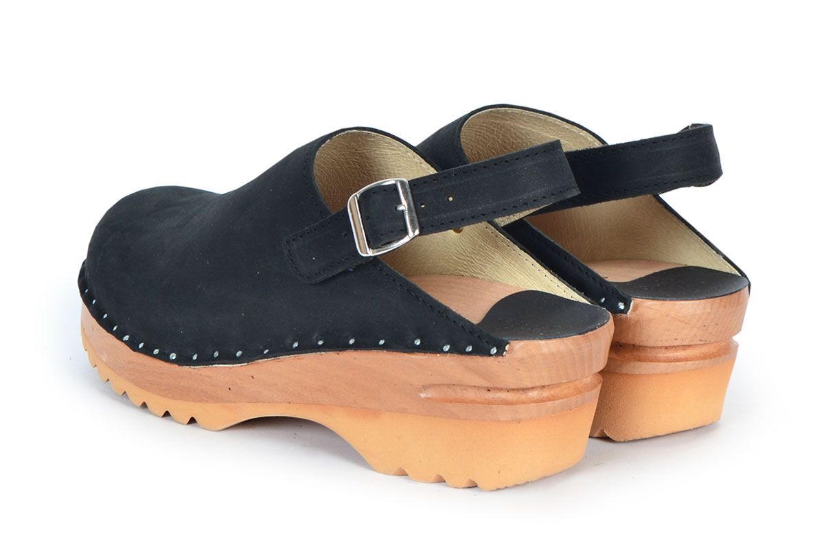 Clean Swedish clog design with an adjustable heel strap. Here in black nubuck leather, and on our varnished Ideal wooden clog bottoms with a natural alderwood footbed. Since the Adrian is bit a snug over the instep, it is not recommended for someone with a high instep.