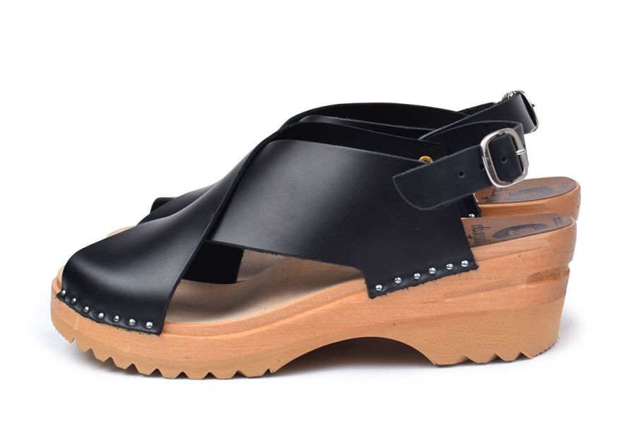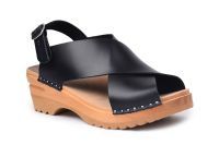 Anita is a classic Swedish clog style with two straps over the instep and an adjustable ankle strap. Here in black pull up leather on a varnished wooden clog bottom.