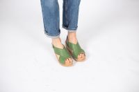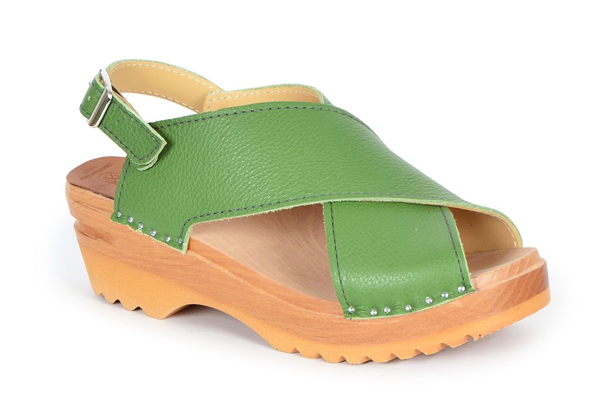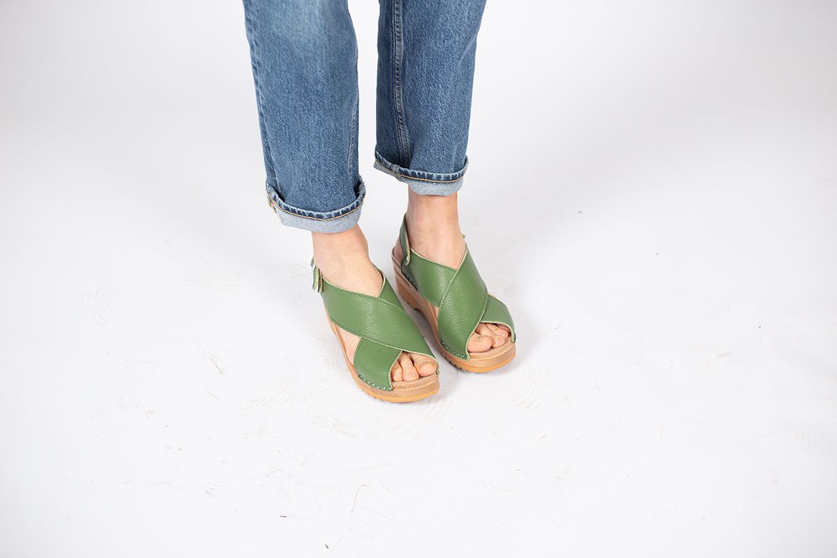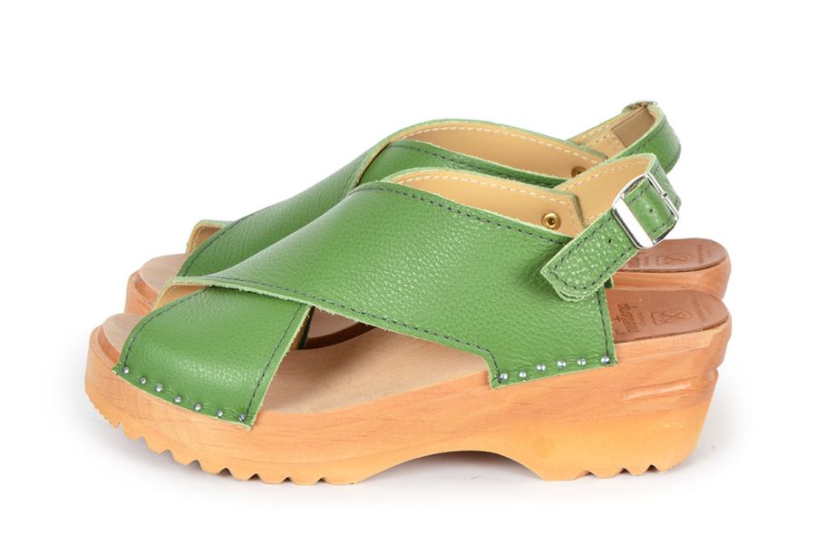 Anita has a classic cross-over design with two straps over the instep and an adjustable ankle strap with elastic. Here in ochre yellow pebbled leather with soft leather lining on a varnished Ideal base.