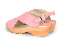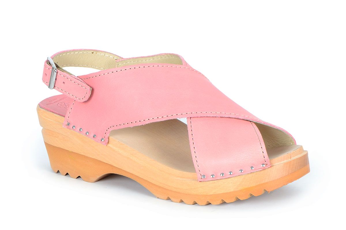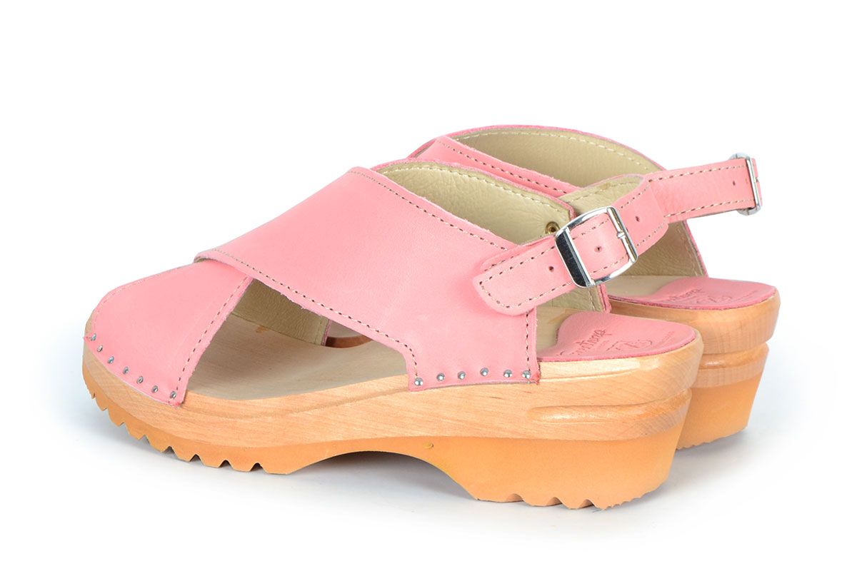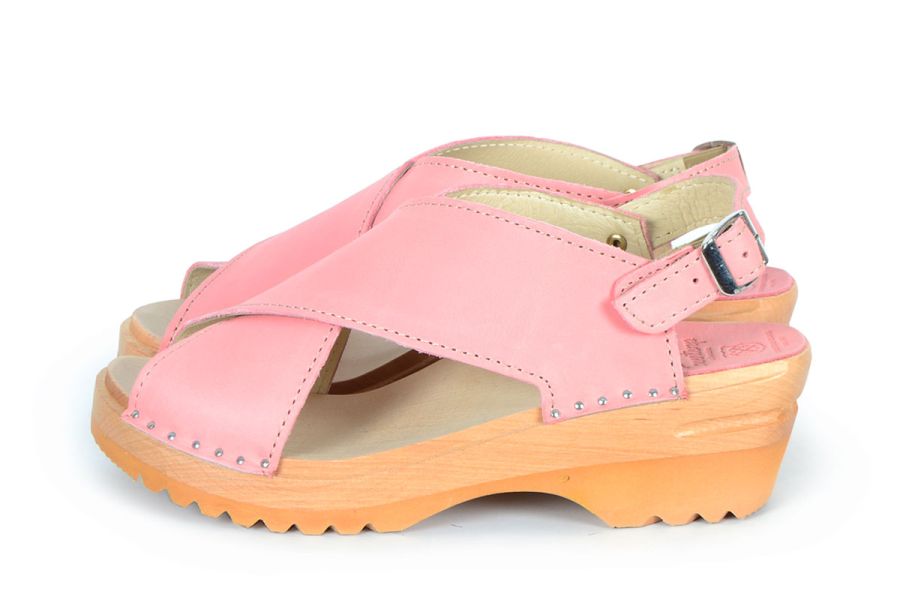Anita is a classic Swedish clog style with two straps over the instep and an adjustable ankle strap. Here in pink vegetable tanned leather on a varnished wooden clog bottom. The vegetable tanned leather should be kept away from water as it is sensitive to water stains but it will age with a beautiful rich patina.