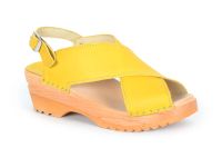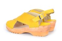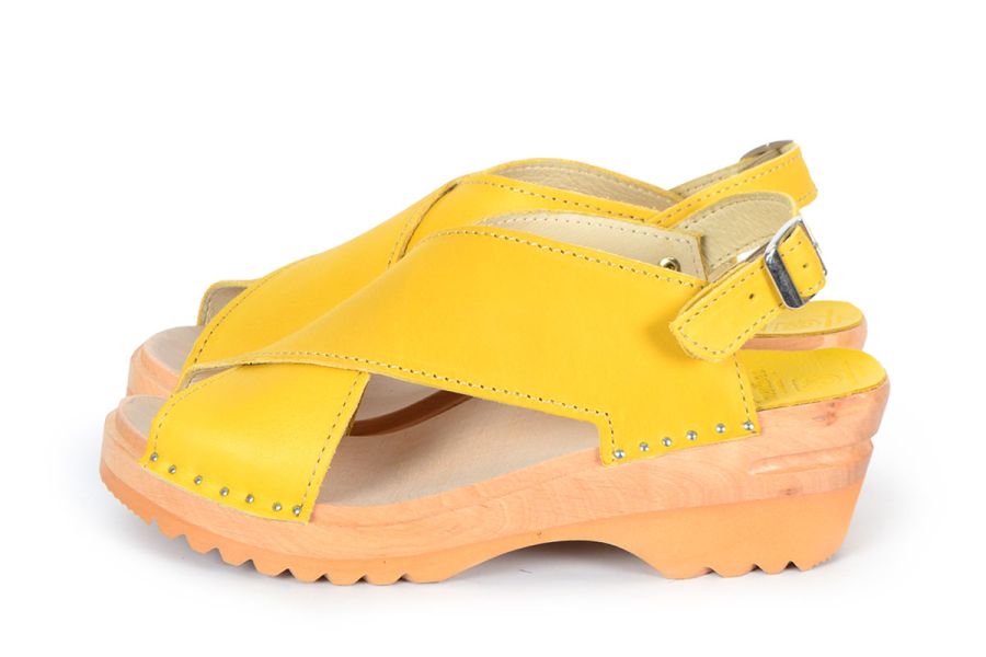Anita is a classic Swedish clog style with two straps over the instep and an adjustable ankle strap. Here in yellow vegetable tanned leather on a varnished wooden clog bottom. The vegetable tanned leather should be kept away from water as it is sensitive to water stains but it will age with a beautiful rich patina.
