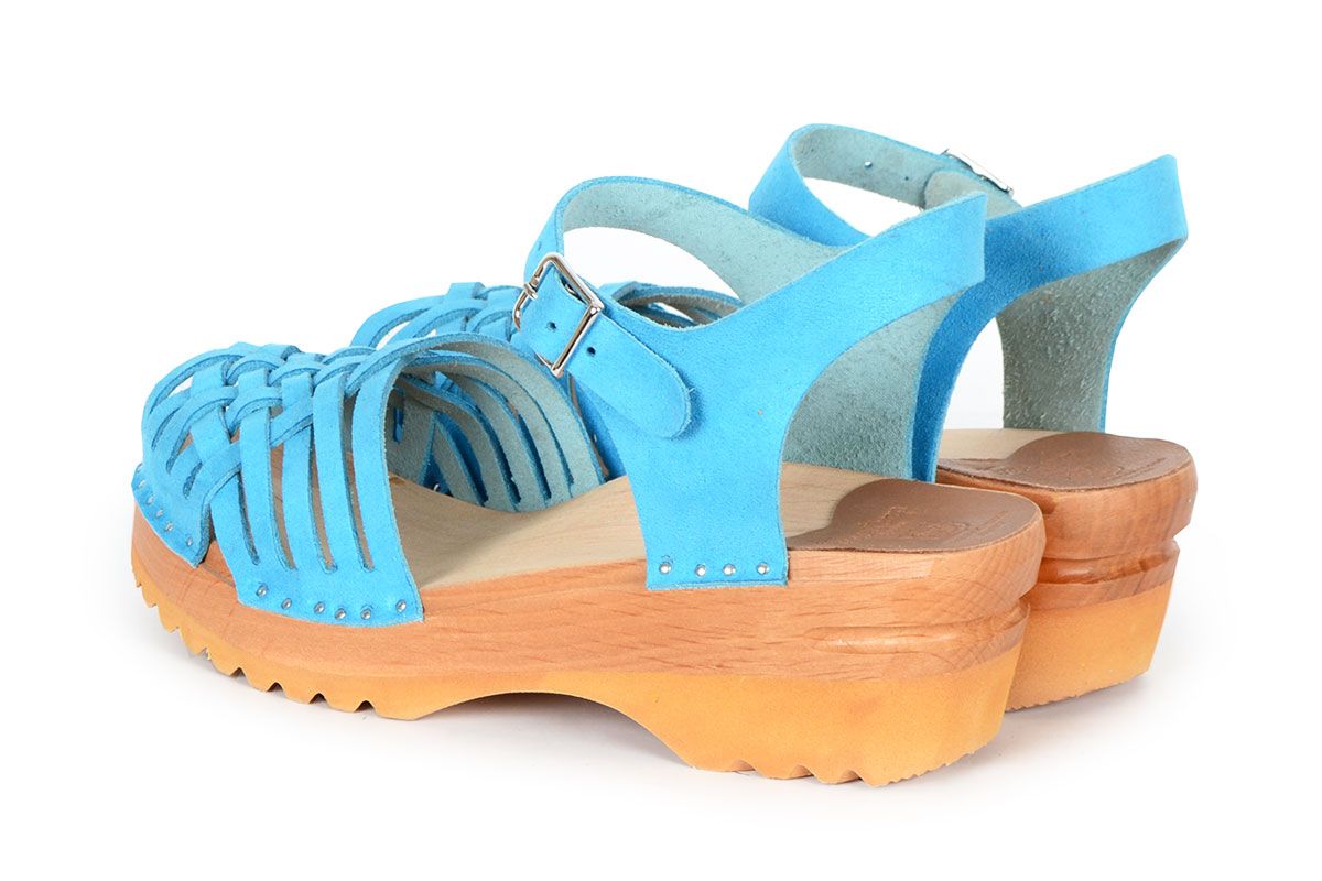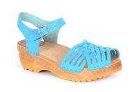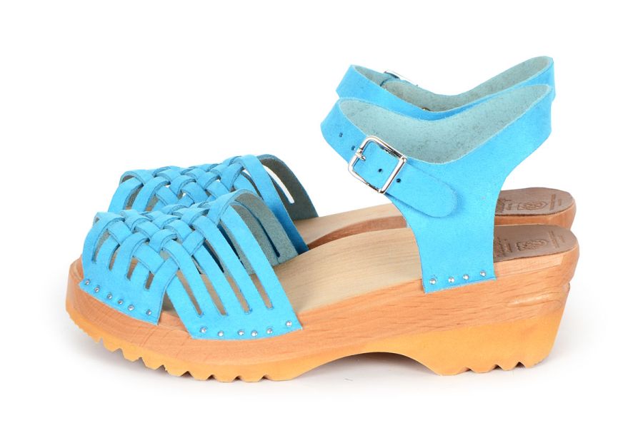 Clog Sandal with a braided front and adjustable ankle strap. Here in aqua blue suede leather, made on our varnished Ideal clog bottoms.