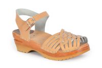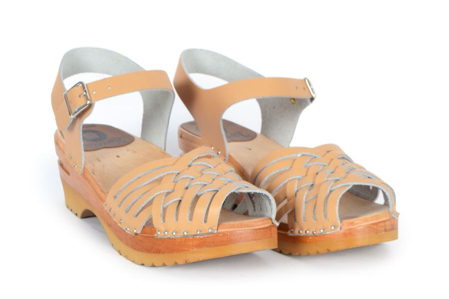 Clog Sandal with a braided front and adjustable ankle strap. Here in beige leather, made on our varnished Ideal clog bottoms.