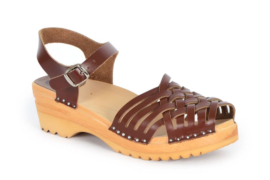 Clog Sandal with a braided front and adjustable ankle strap. Here in brown leather, made on our varnished Ideal clog bottoms.