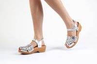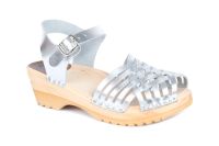 Clog Sandal with a braided front and adjustable ankle strap. Here in silver leather, made on our natural Ideal clog bottoms.