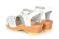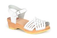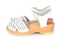 Clog Sandal with a braided front and adjustable ankle strap. Here in white suede leather, made on our varnished Original clog bottoms.