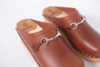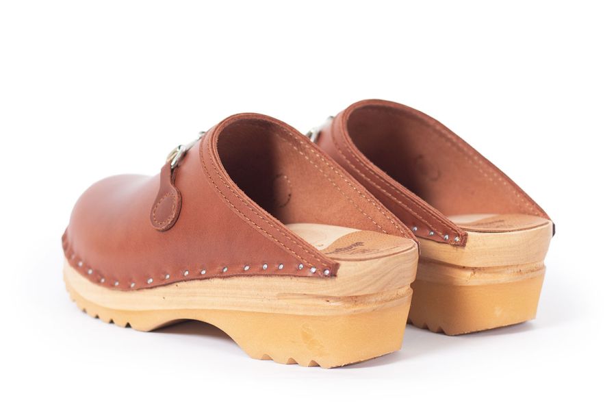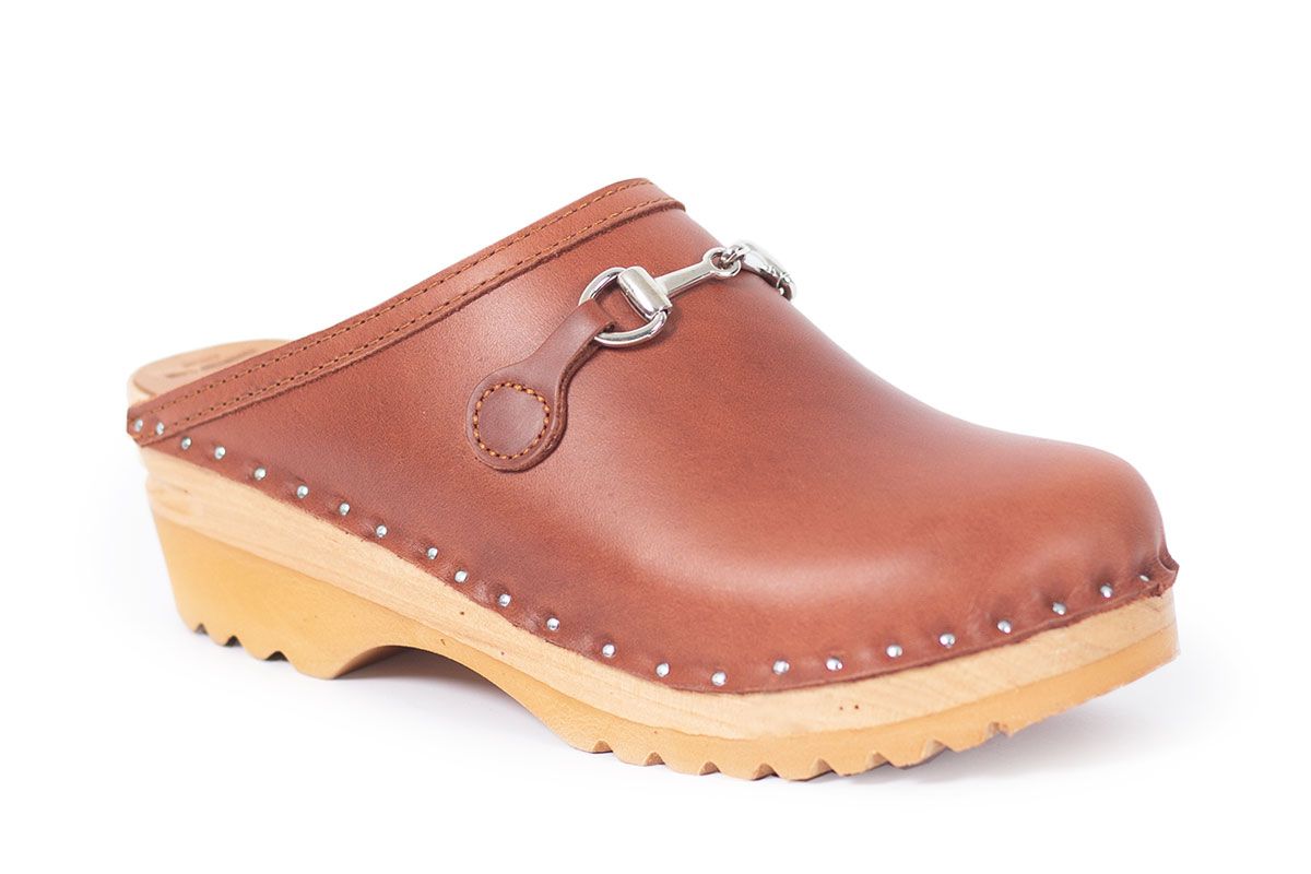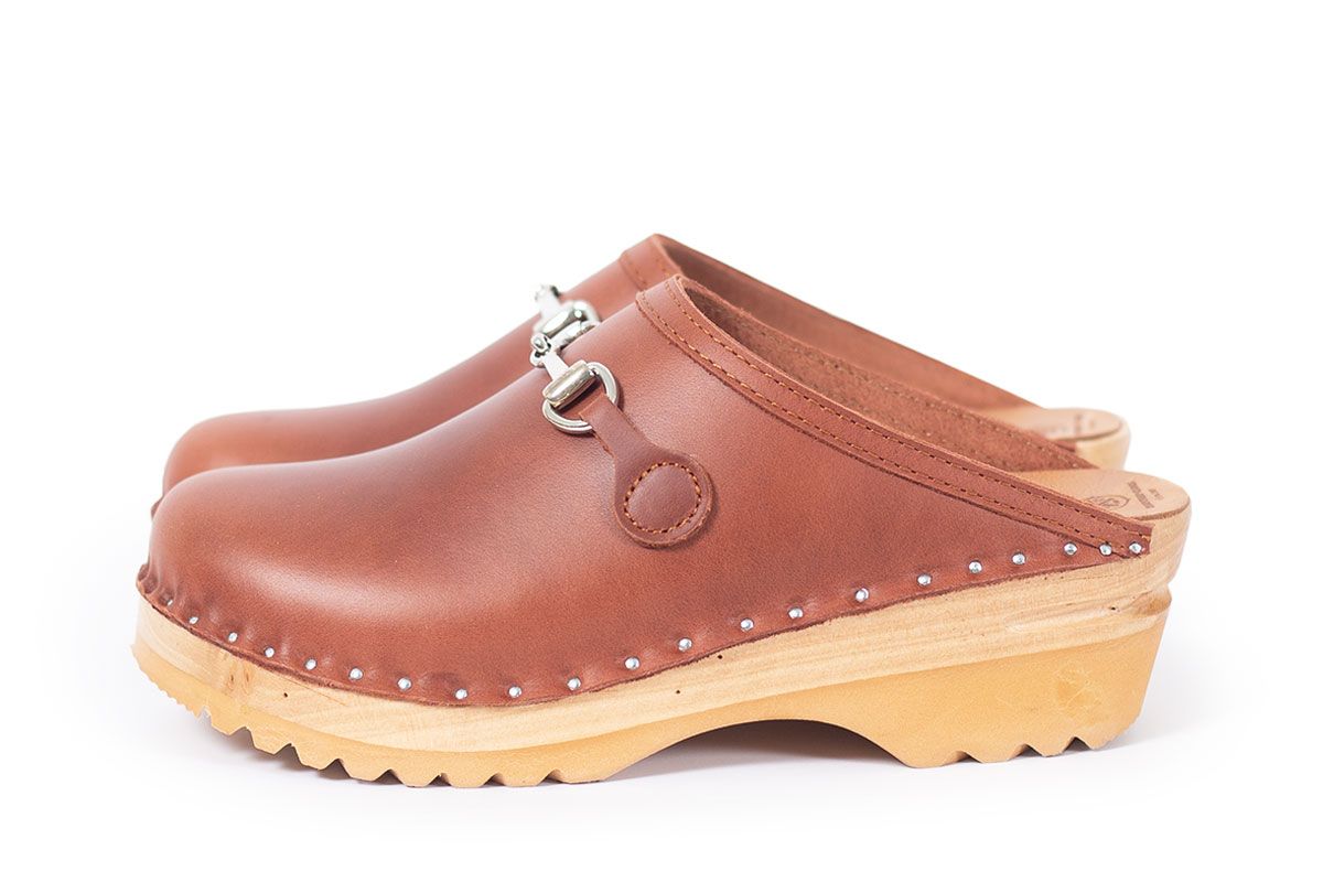 Calder is a classic clog style with an elegant horse-bit detail. Here in a Copper leather . The uppers are nailed onto our varnished Ideal bases.