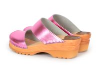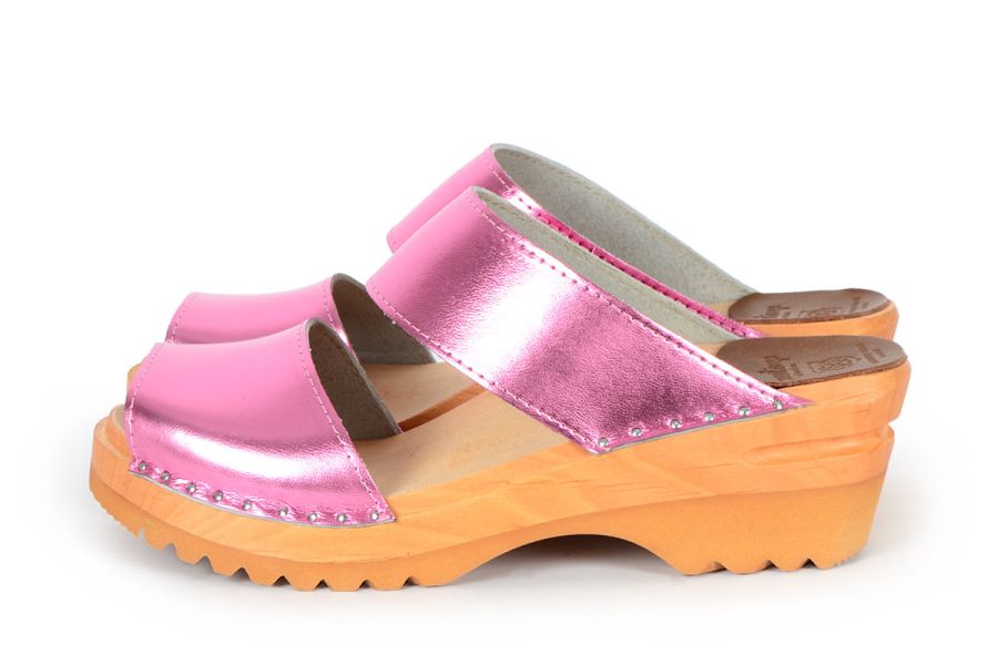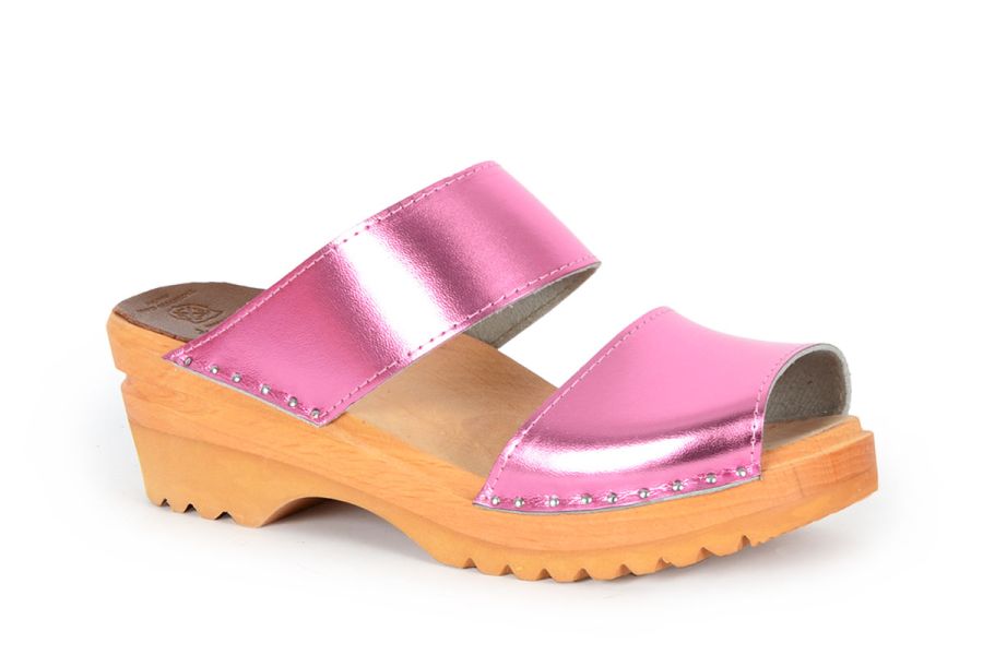 Clog sandal in pink metallic leather. Karin has a clean design with two straps over the instep and are made on our varnished Ideal bottoms.