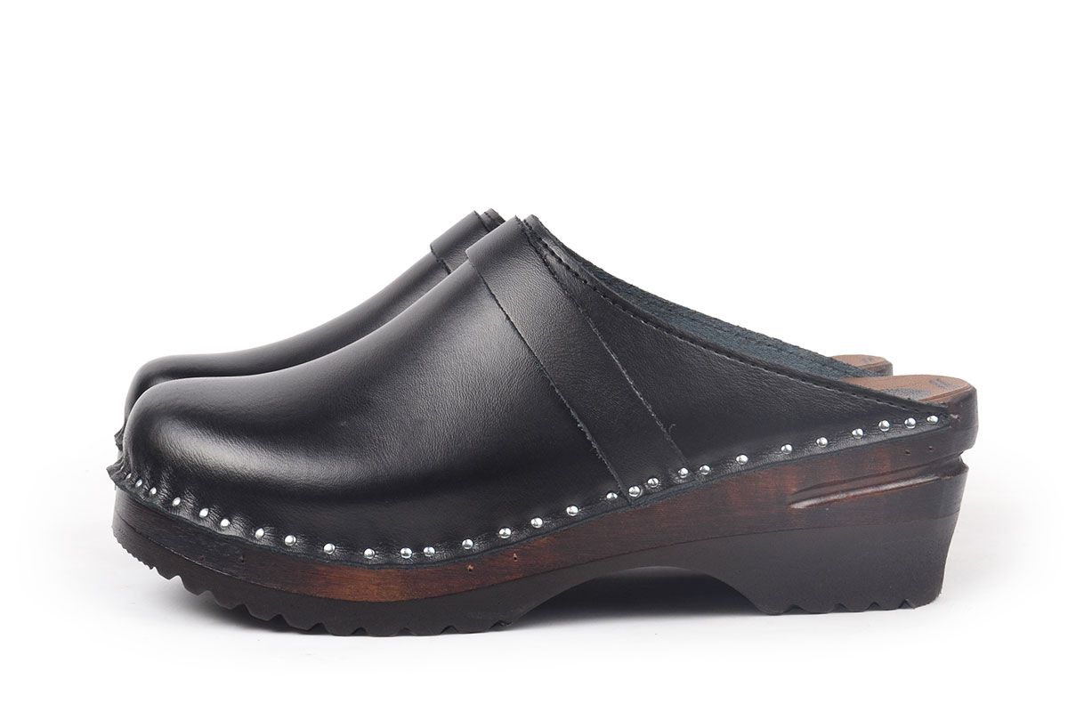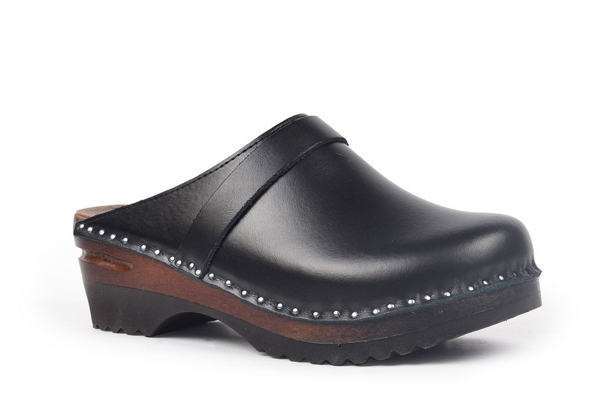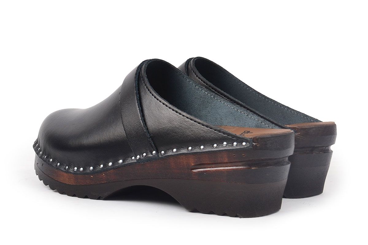 Classic Swedish clog style in black leather. Made on a brown stained and varnished Ideal bottom.