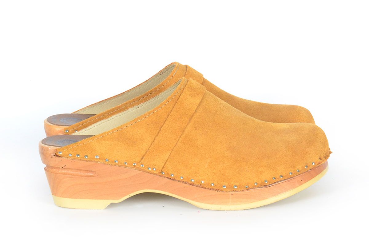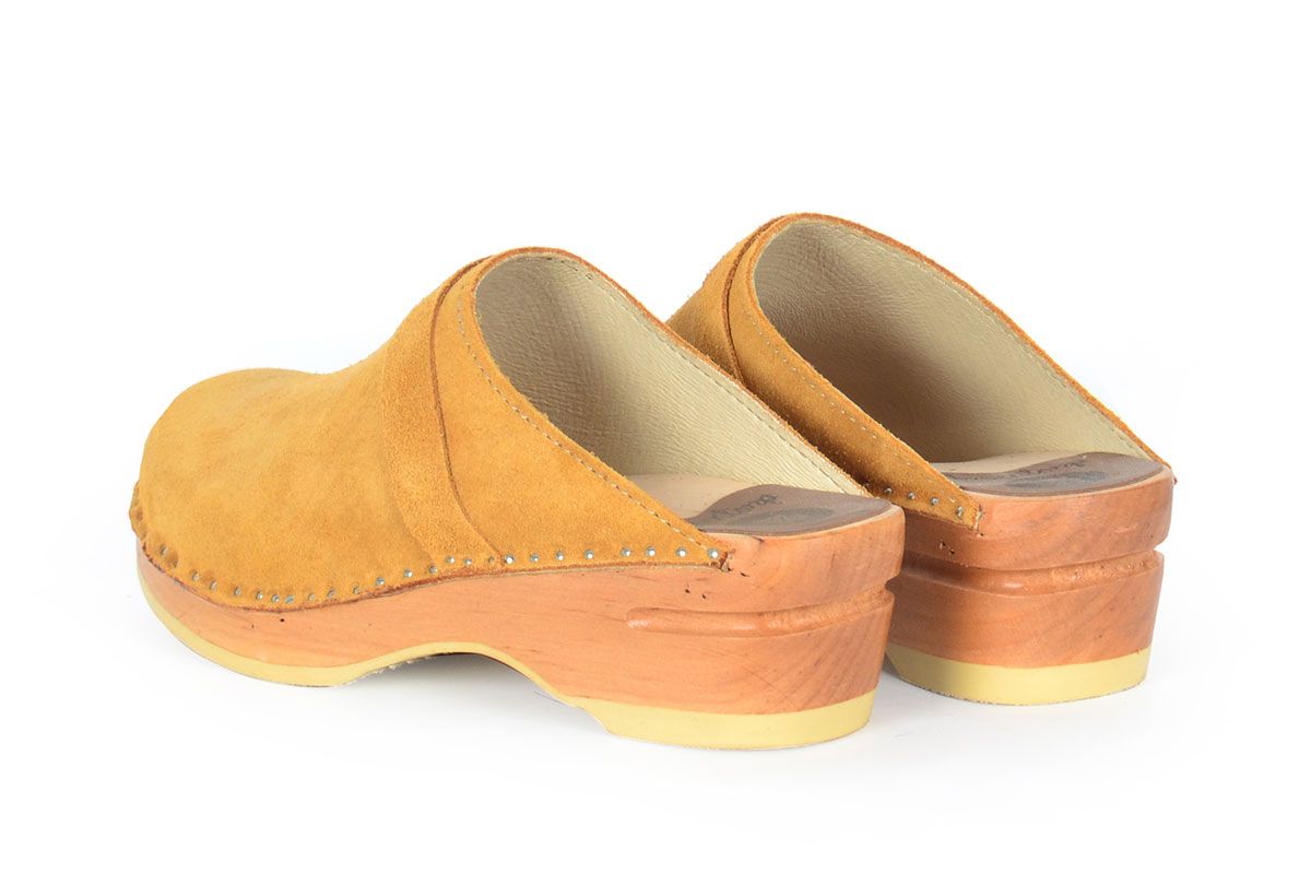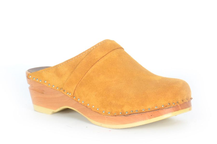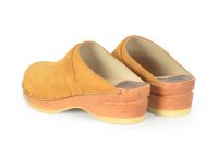 Da Vinci clogs in camel suede leather with soft leather lining and a classic strap over the instep. Made on our natural Original bottoms.