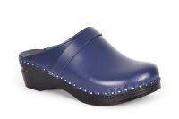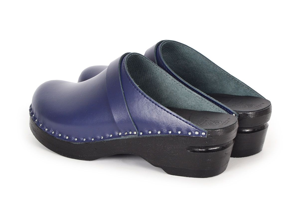 The Da Vinci clog in navy blue leather with a classic strap over the instep. Made on our black stained and painted Original bottoms.
