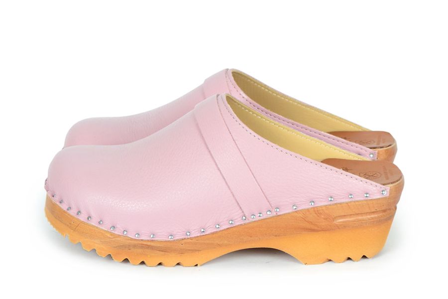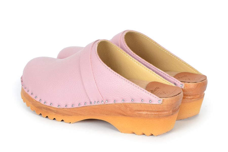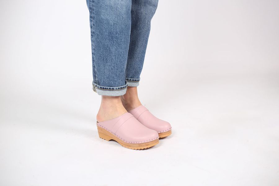 Clean Swedish clog design in powder pink pebbled leather made on our varnished Ideal wooden clog bottoms.