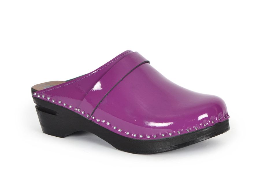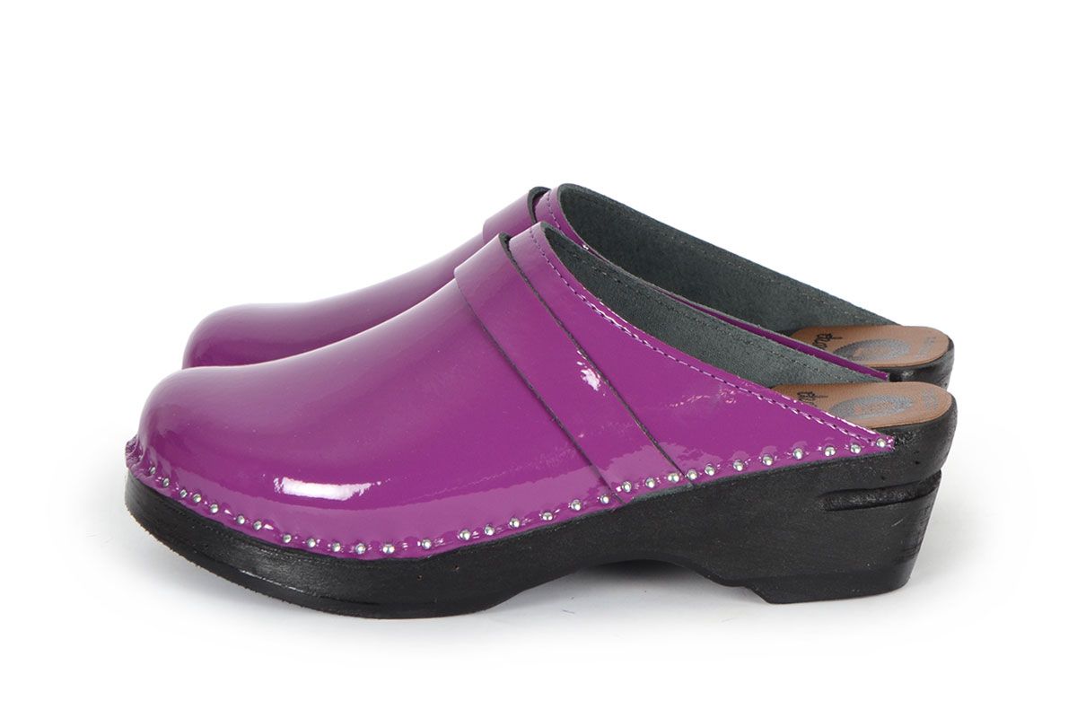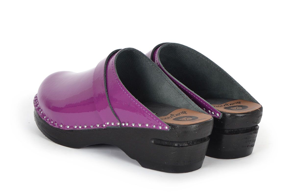 Classic Swedish clog style in purple patent leather. Made on our black painted Original bottoms.