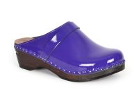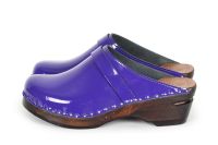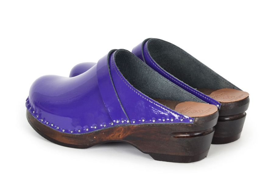 The Da Vinci clog in purple patent leather with a classic strap over the instep. Made on our brown stained and varnished Original bottom.