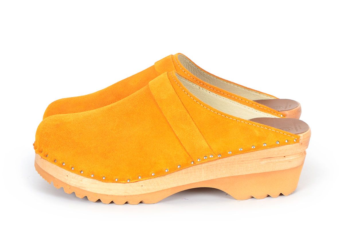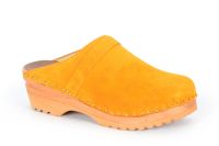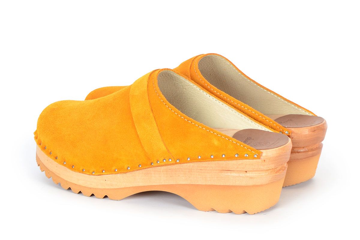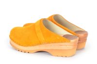 Classic Swedish clog style in saffron suede leather with soft leather lining. Made on our varnished Ideal wooden clog bottoms.