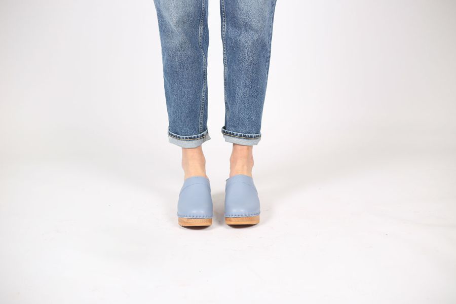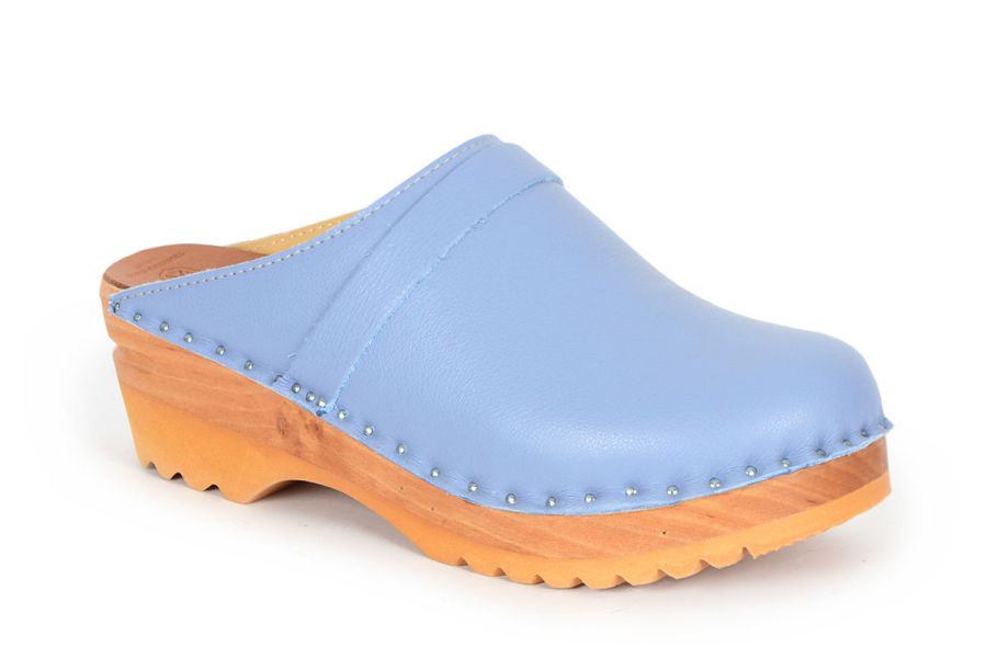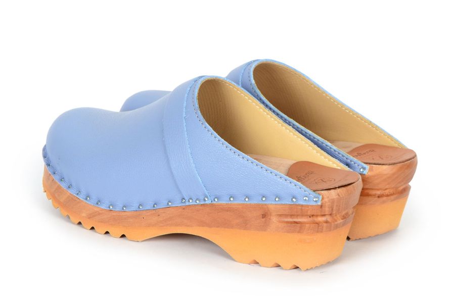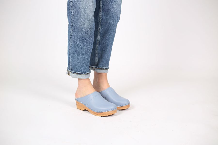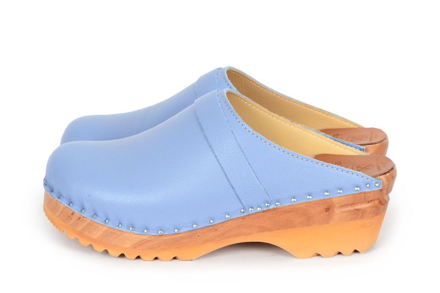 Clean Swedish clog design in surf blue pebbled leather made on our varnished Ideal wooden clog bottoms.