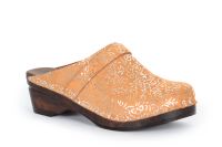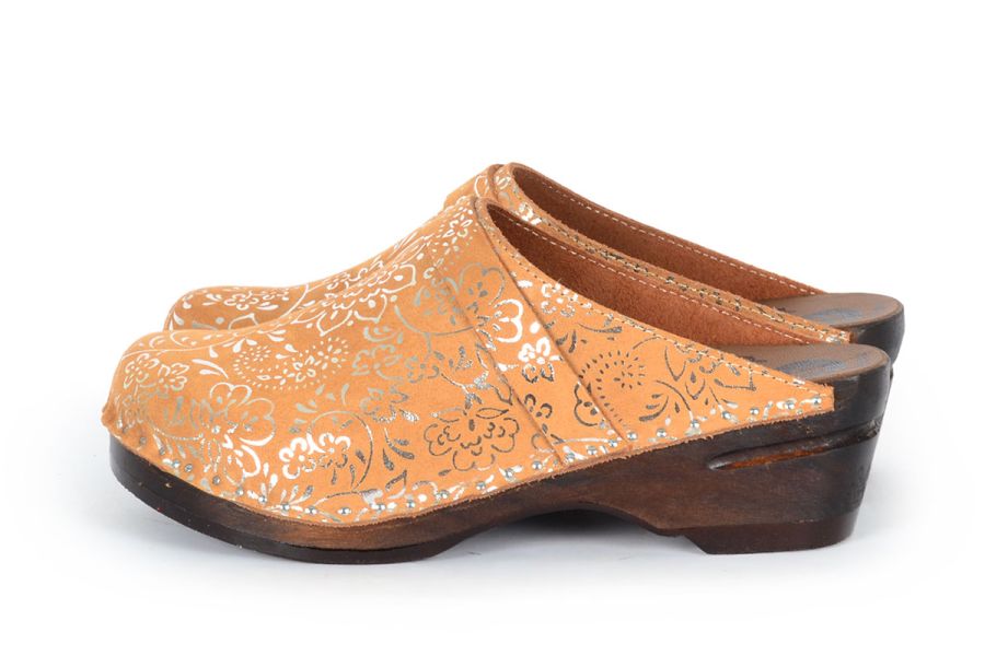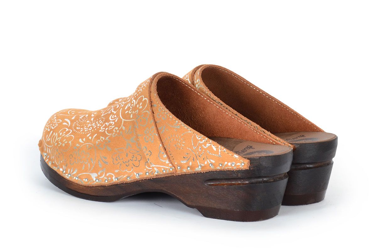 Da Vinci clogs in toffee suede with silver flowers and a classic strap over the instep. Made on our brown stained and varnished Original bottoms.