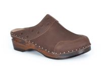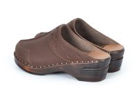 Durer clogs in brown nubuck leather. Made on our brown Original wooden bottoms.