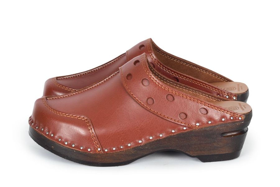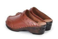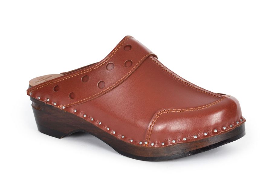 The Durer clog was designed in 1975 has been in production ever since. Here in brown leather and built on our brown stained and varnished Original base.