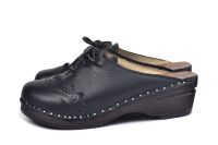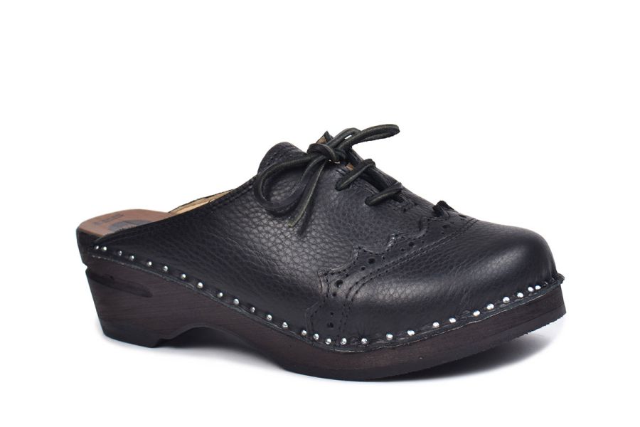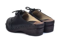 Lace up clog with leather straps for adjustability over the instep. Here in black leather with soft leather lining and on our black stained Original bottoms.
