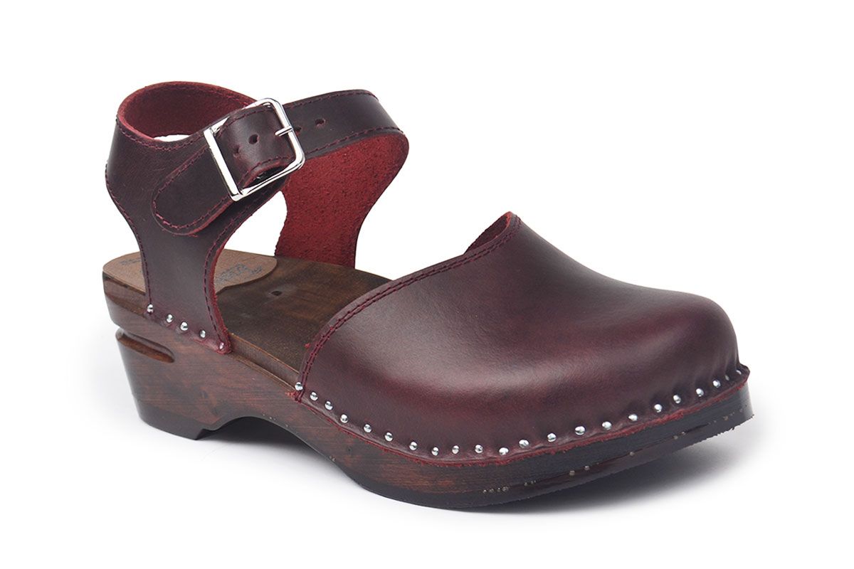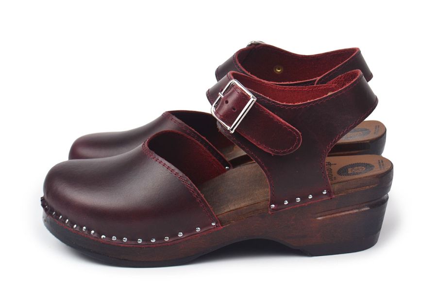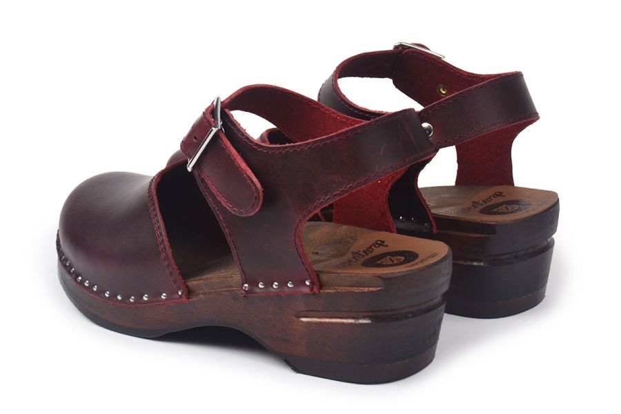 Clog sandal in bordeaux pull up leather with an adjustable ankle strap, made on our brown Original wooden bottoms.