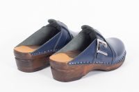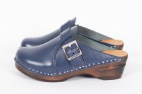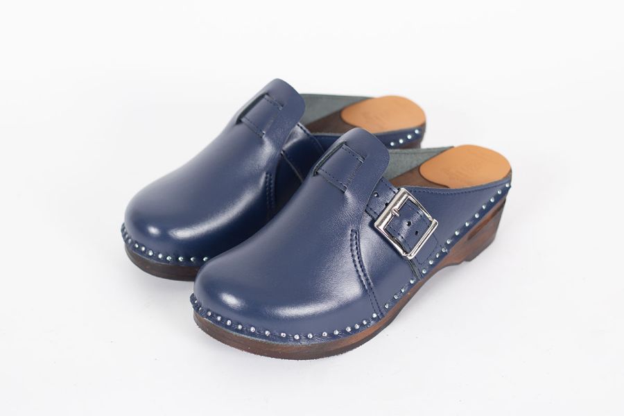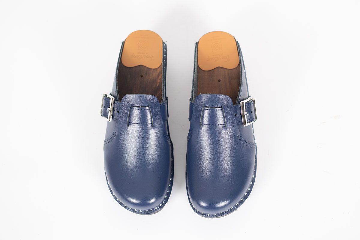 Hopper features an adjustable strap over the instep with a large silver buckle to ensure a good fit. Here in dark blue leather.