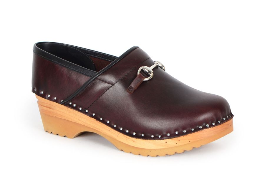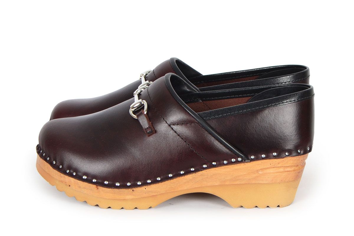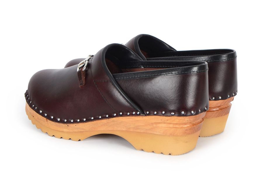 Josefin is a classic closed back clog shoe with an elegant horse-bit detail. Here in brown pull up leather, nailed onto our varnished Ideal bottoms.