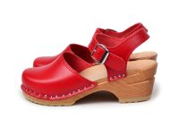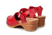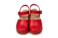 Kids clog sandal in red leather with an adjustable ankle strap and closed toe, made on our varnished wooden bottoms.