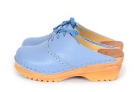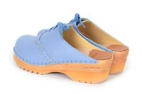 Klein in surf blue leather with laced front. A version of this clog was first released in the 1970's. This brogue-style clog is truly unique. The laced upper allows for an optimal fit while the "brogued" cap-toe offers style and durability.