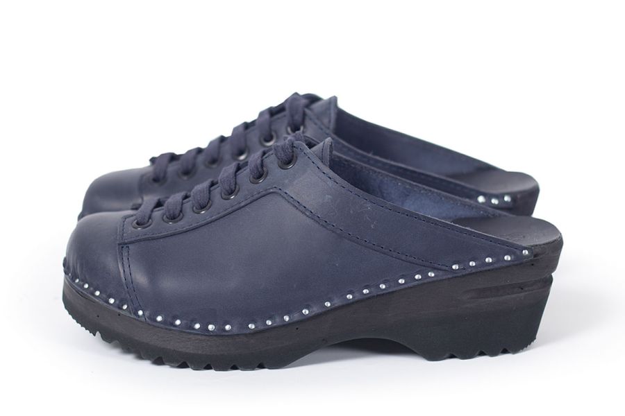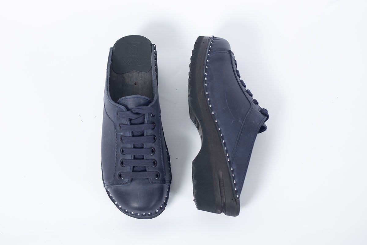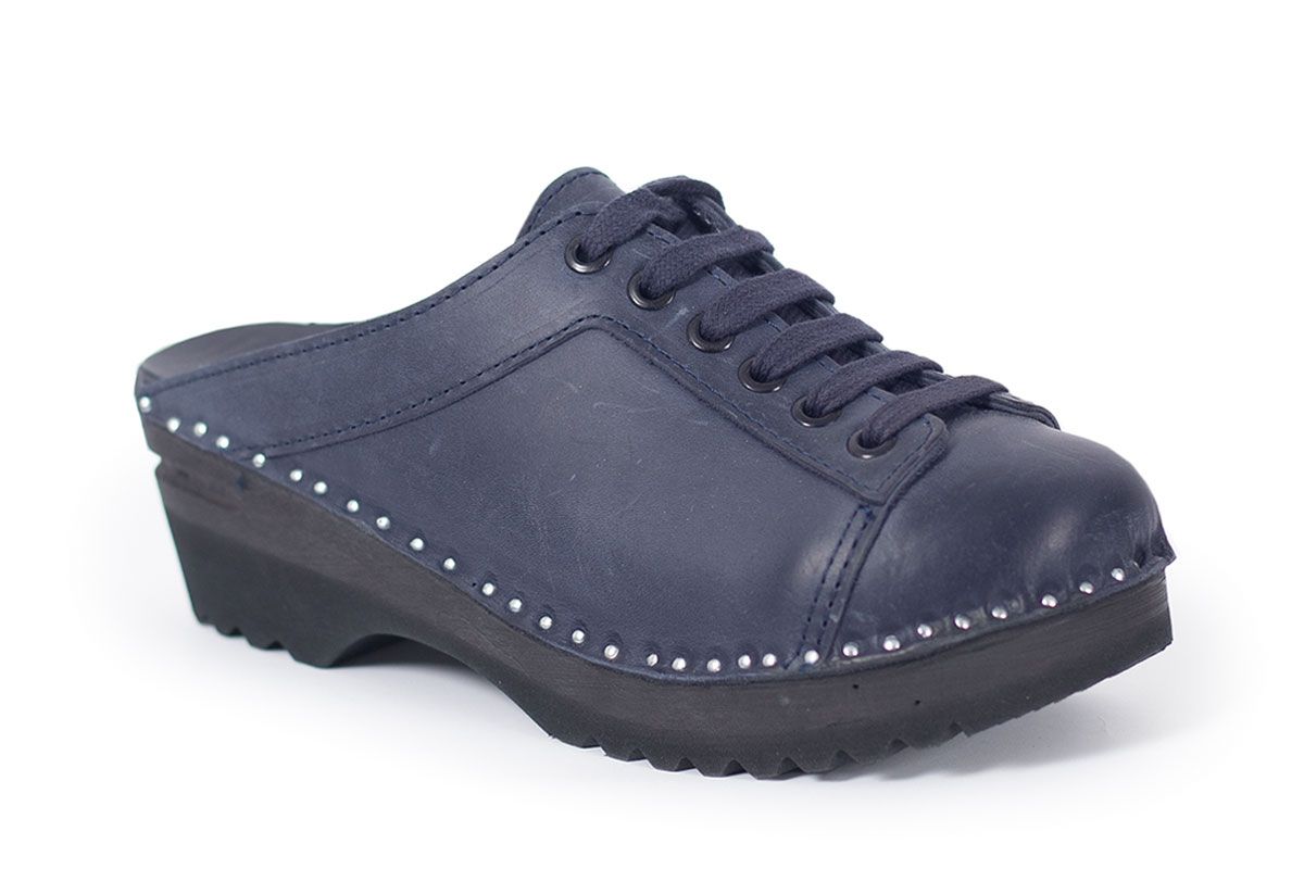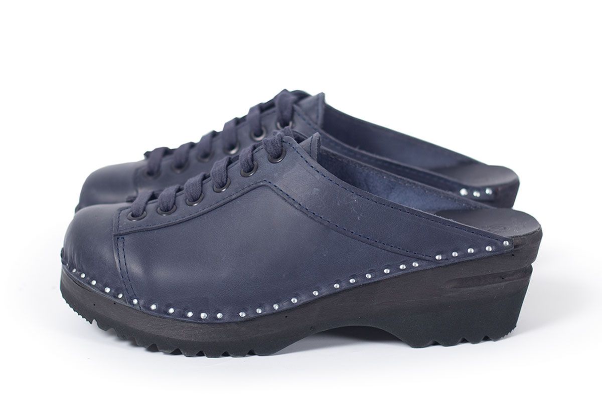 Lace up clog with leather straps for adjustability over the instep. Here in blue leather and on black Ideal bottoms