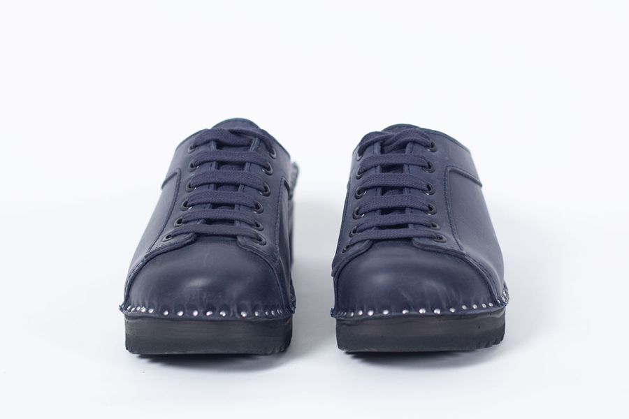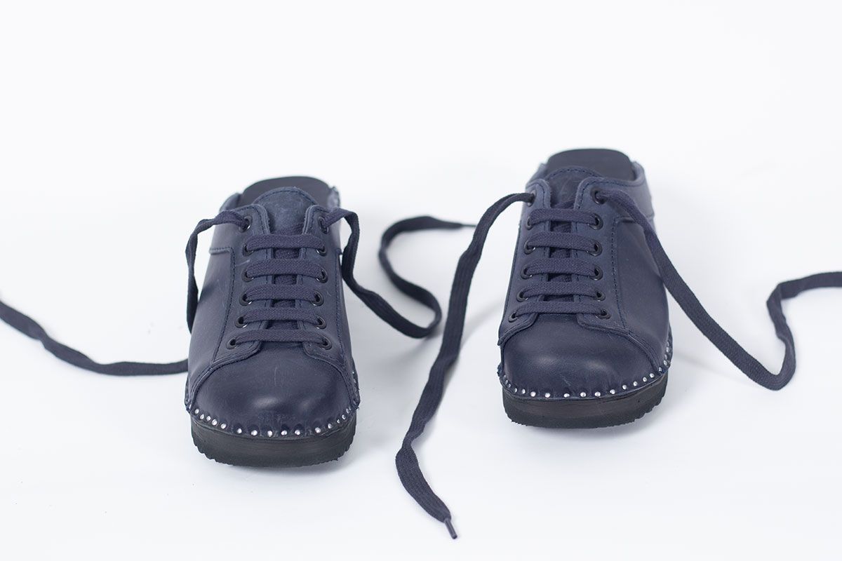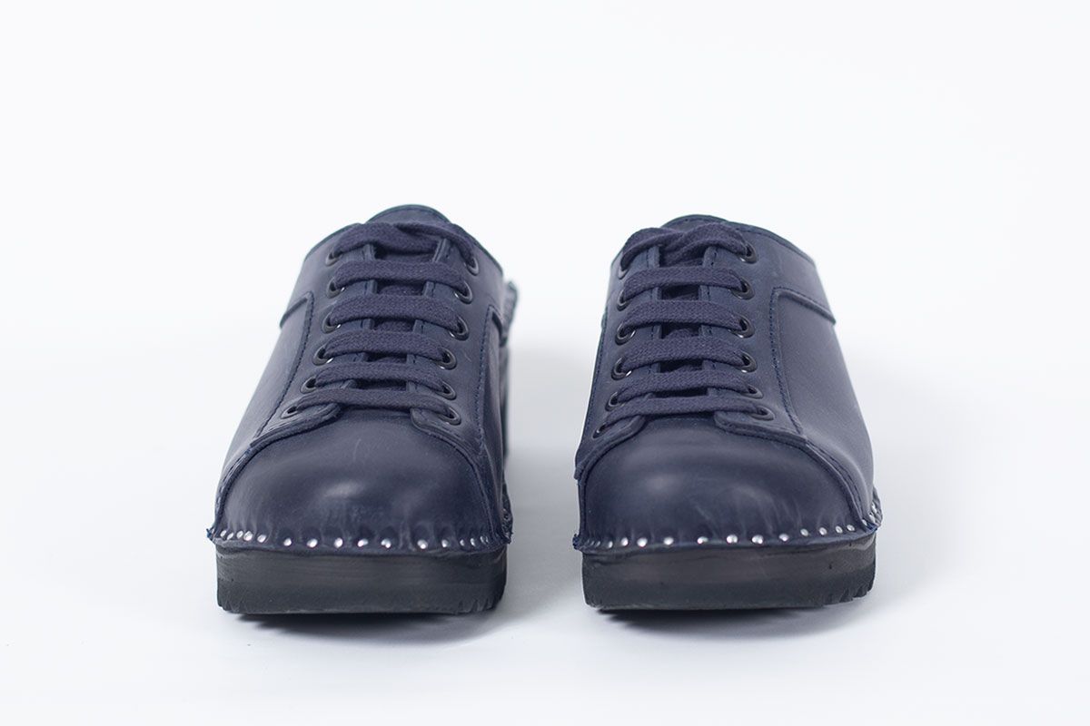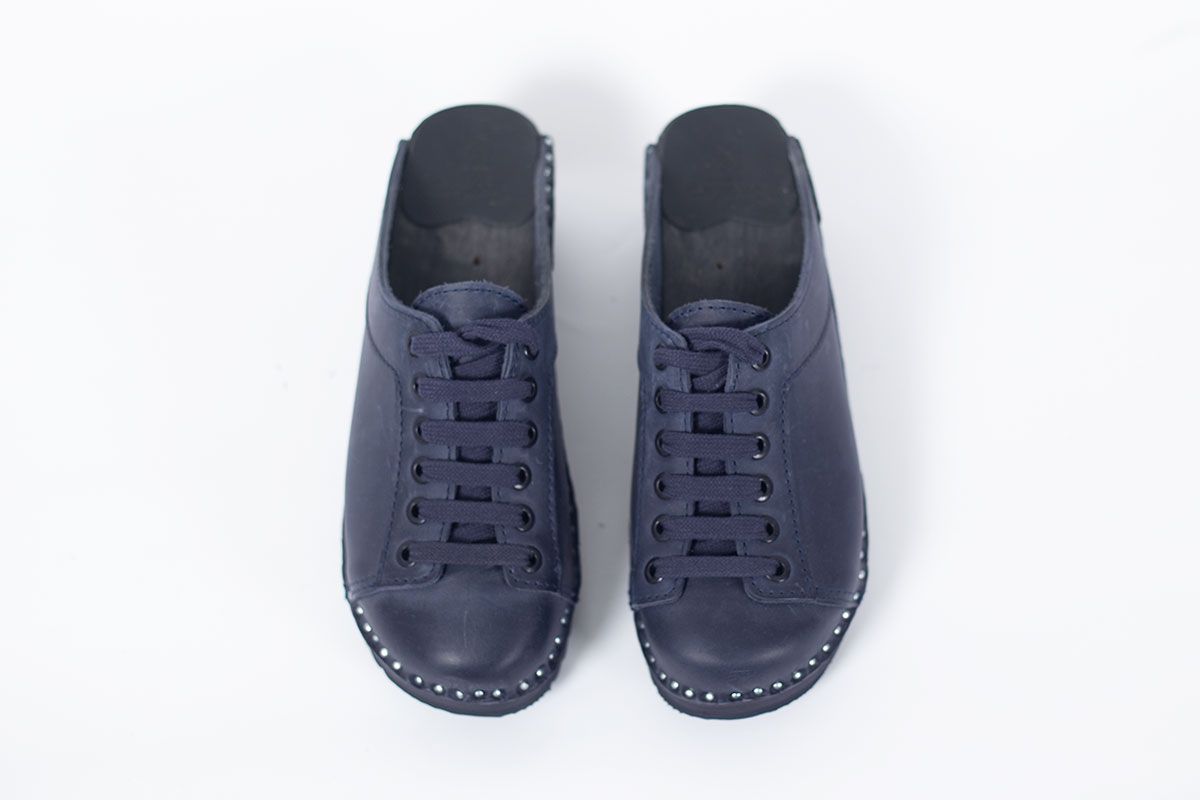 Lace up clog with leather straps for adjustability over the instep. Here in blue leather and on black Ideal bottoms