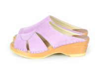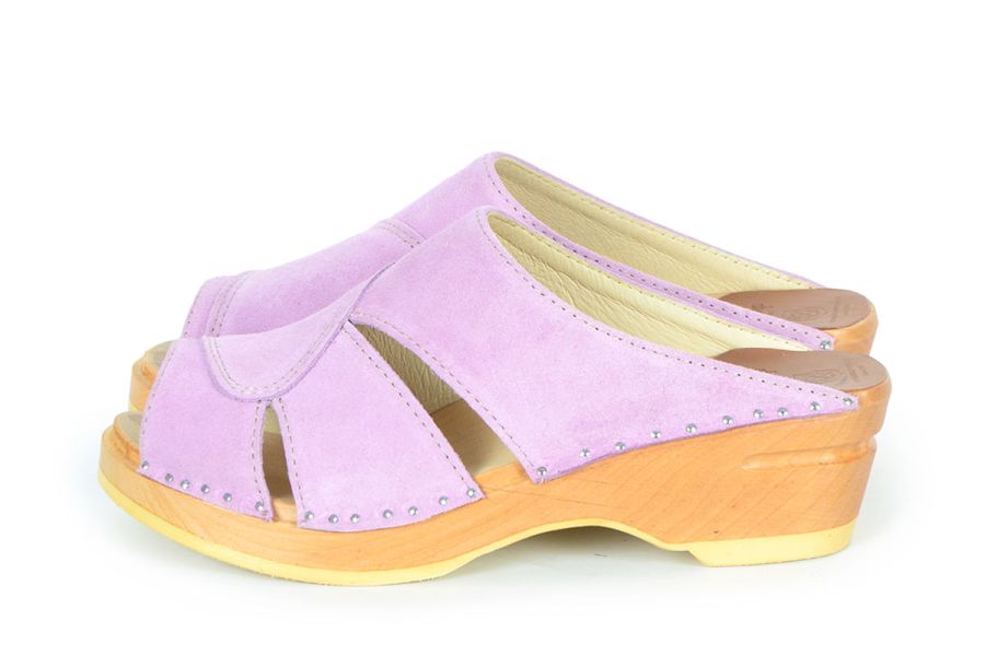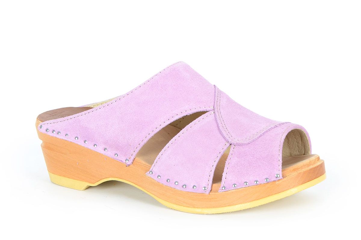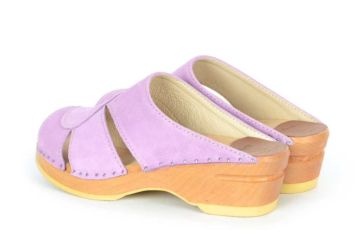 Mariah is one of our best selling open toe clog sandals. Here in lavander suede leather and made on our varnished Original bottoms.