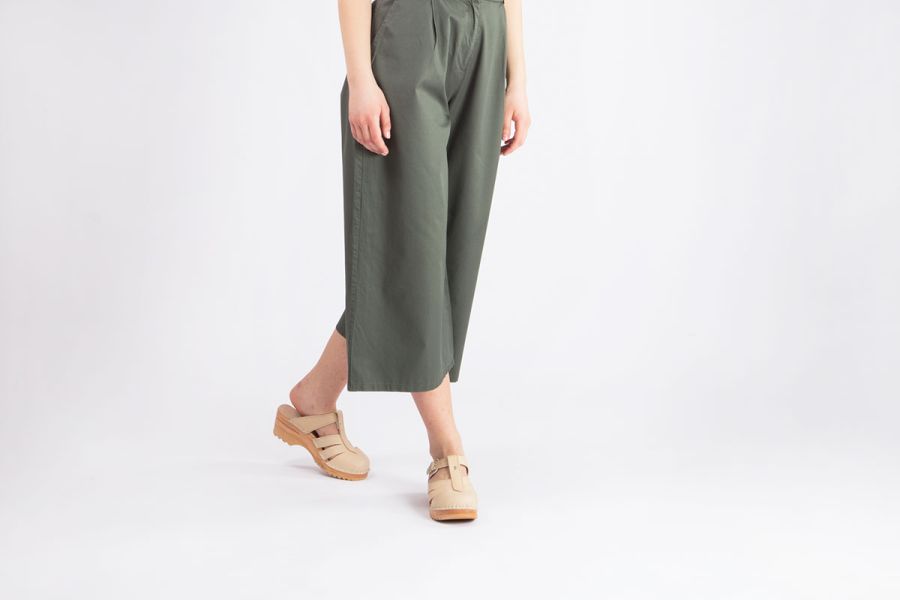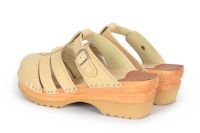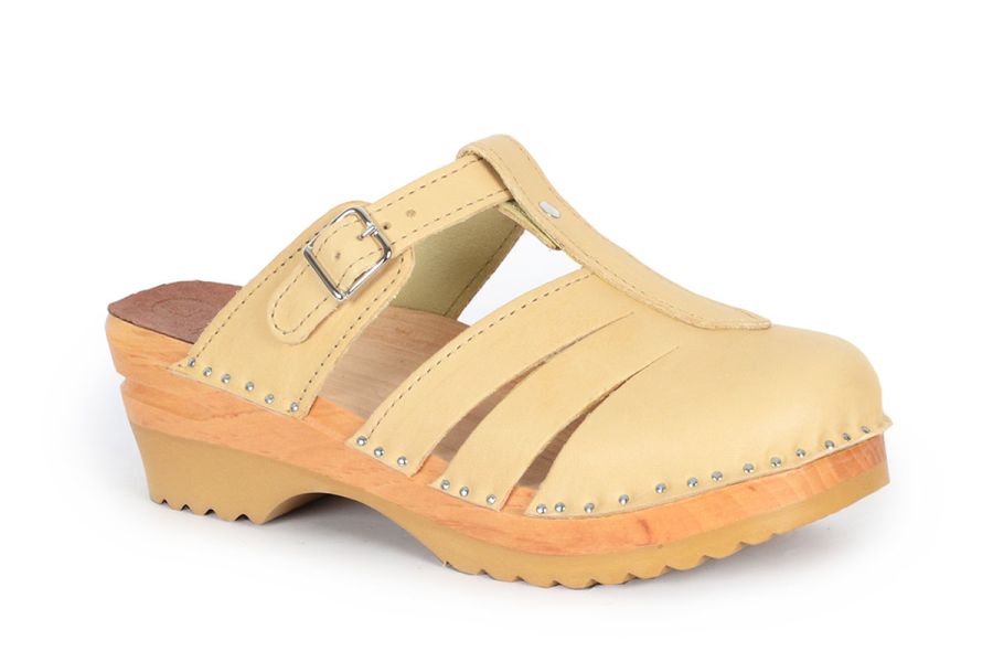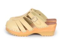 Clog Sandal with airy closed toe design in Natural vegetable tanned leather. This leather will age with a beautiful rich patina, giving a distinctive look to every pair of clogs. A protective coating has been applied to make it less sensitive, but as with all vegetable tanned leathers, it is best to to try and avoid exposure to water and other liquids.