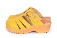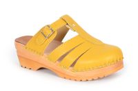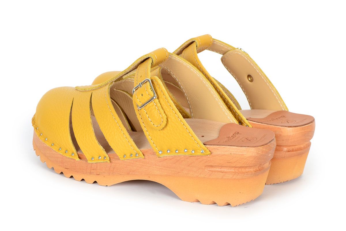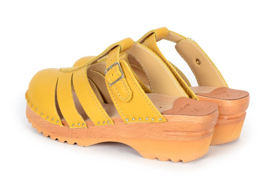 Mary Jane clog sandal in Ochre Yellow leather with an adjustable strap over the instep. Made in a pebbled leather upper that is lined with soft leather lining and nailed onto our slip resistant Ideal base.