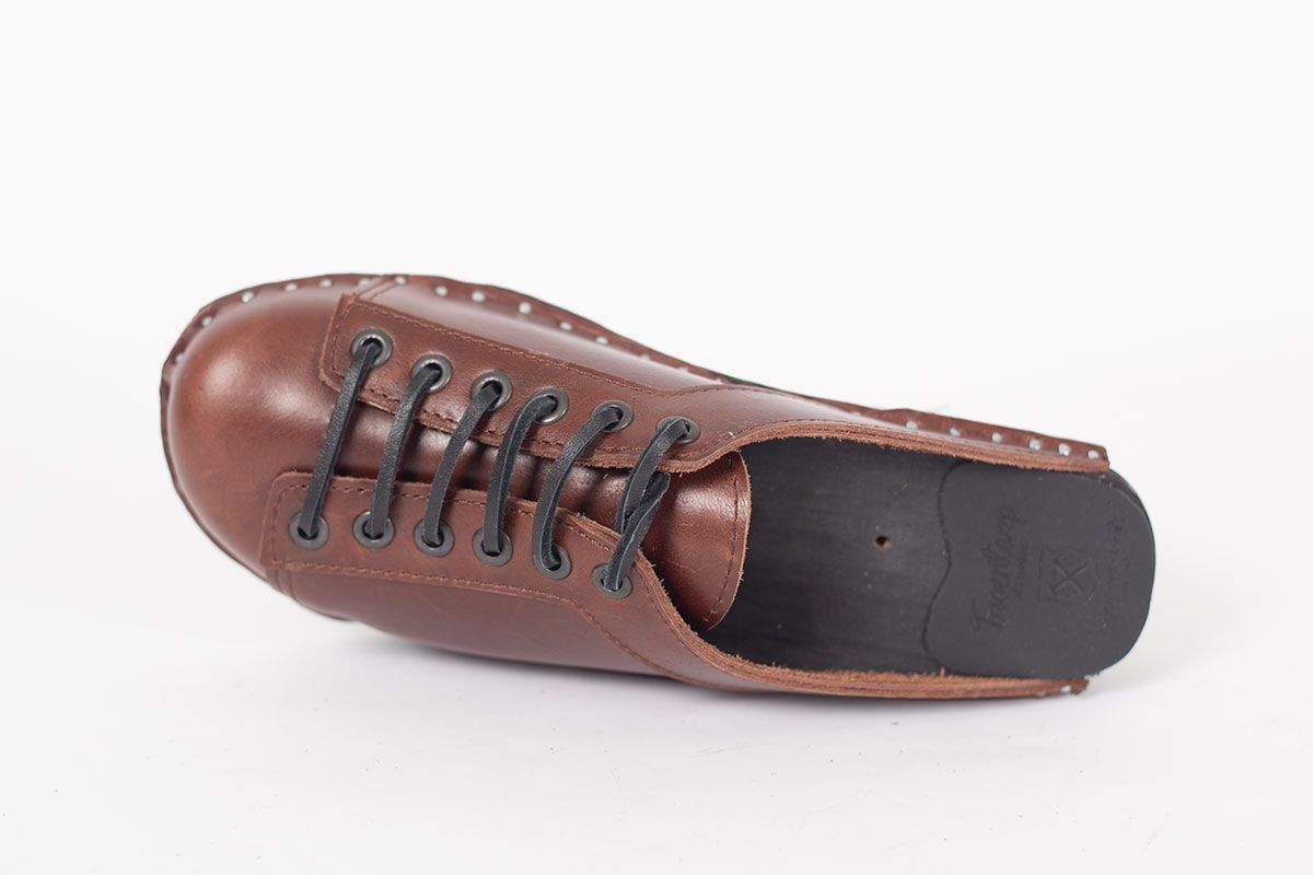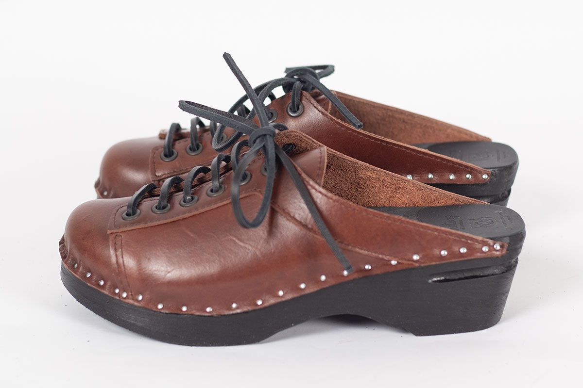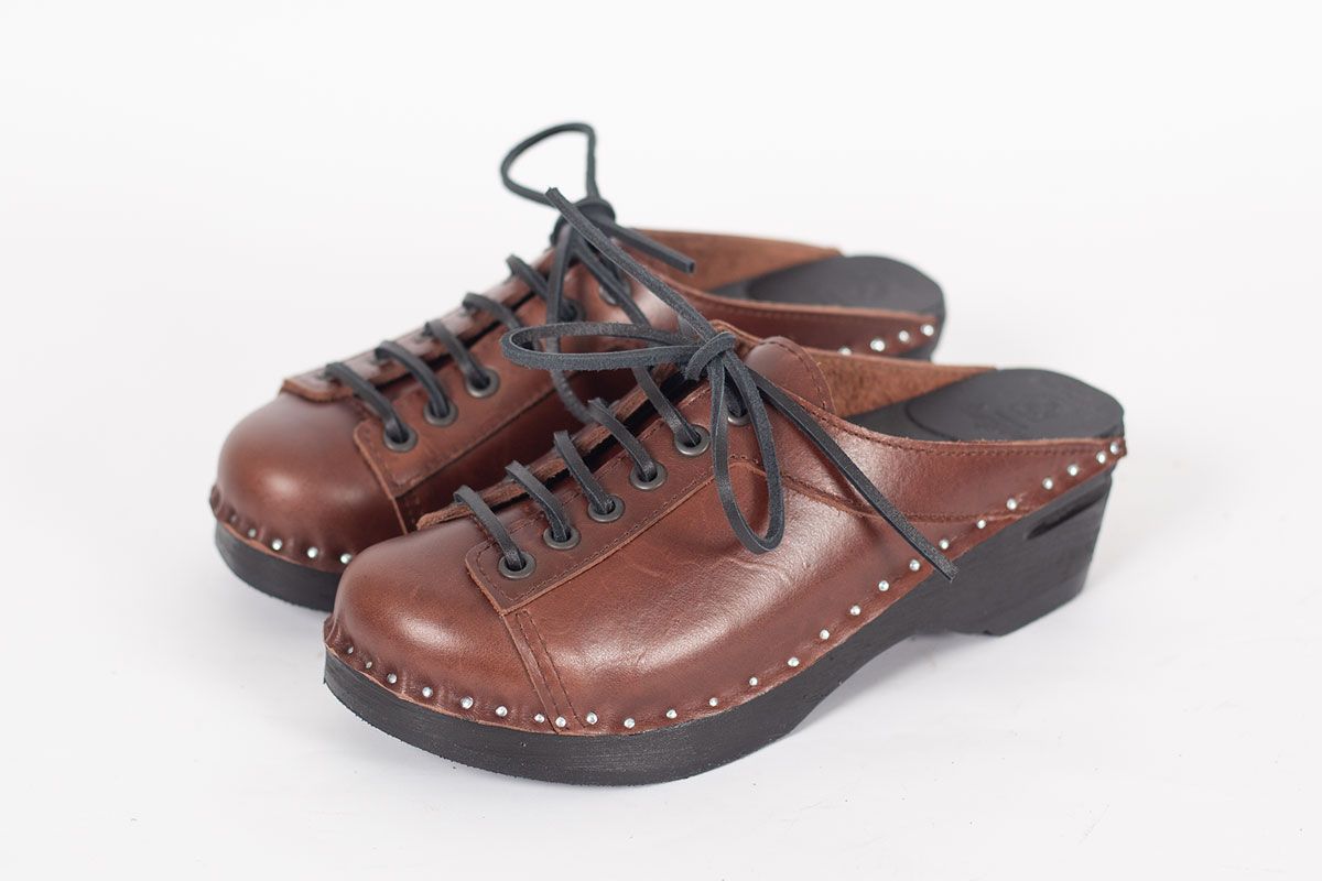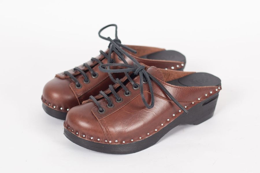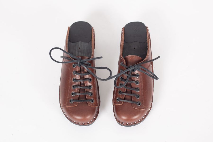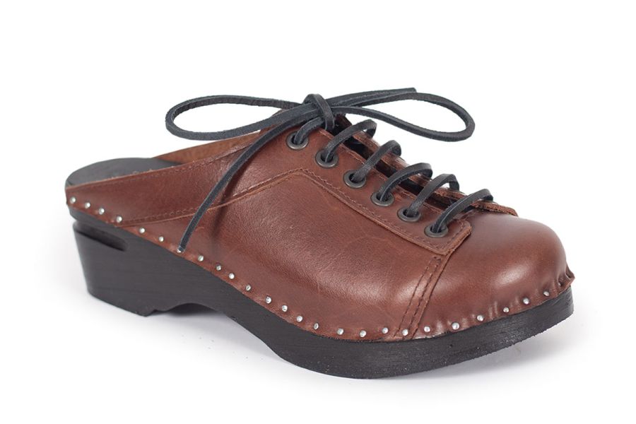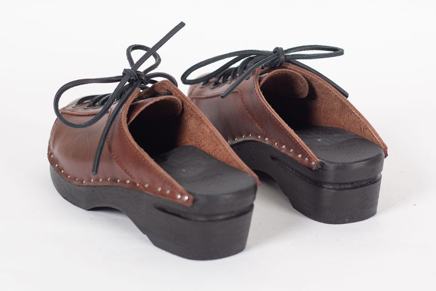 Lace up clog with leather straps for adjustability over the instep. Here in smooth brown leather and on our black painted Original bottoms.