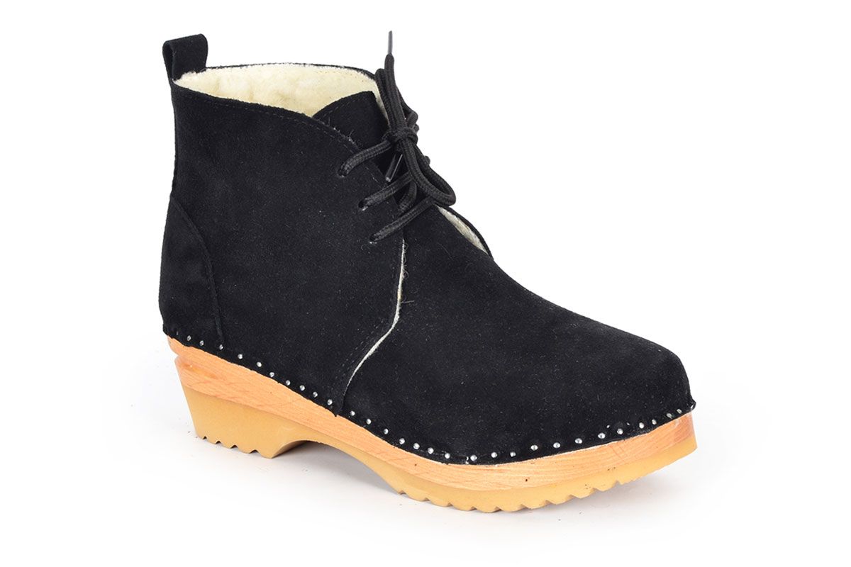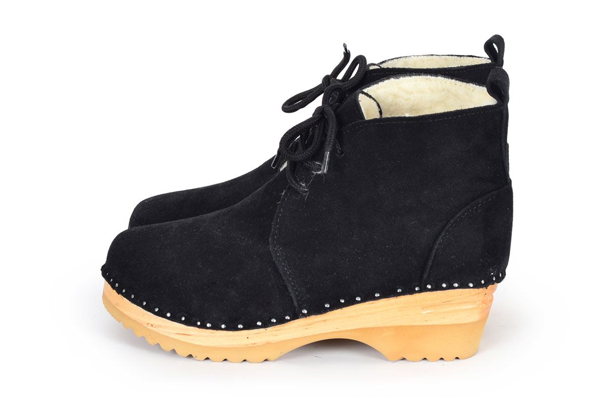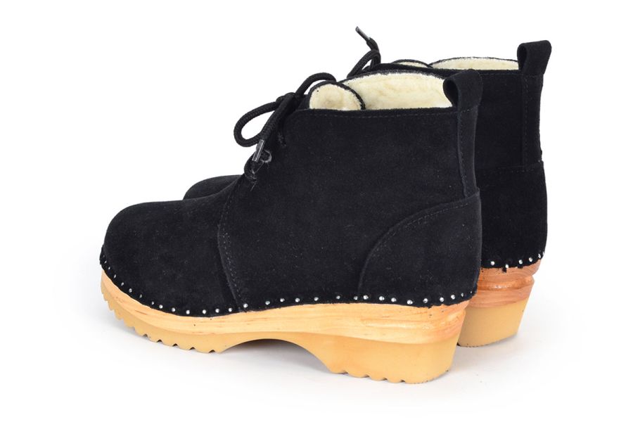 Morris clog boot with leather laces and warm shearling lining for winter wear. Here in a black suede and on our varnished Ideal bottoms.