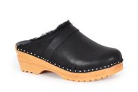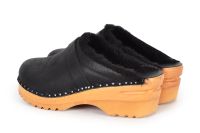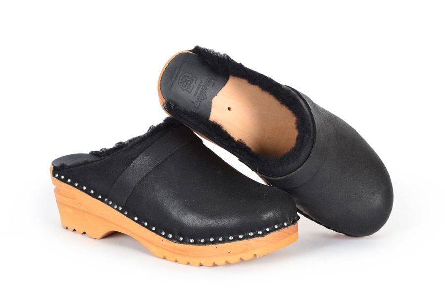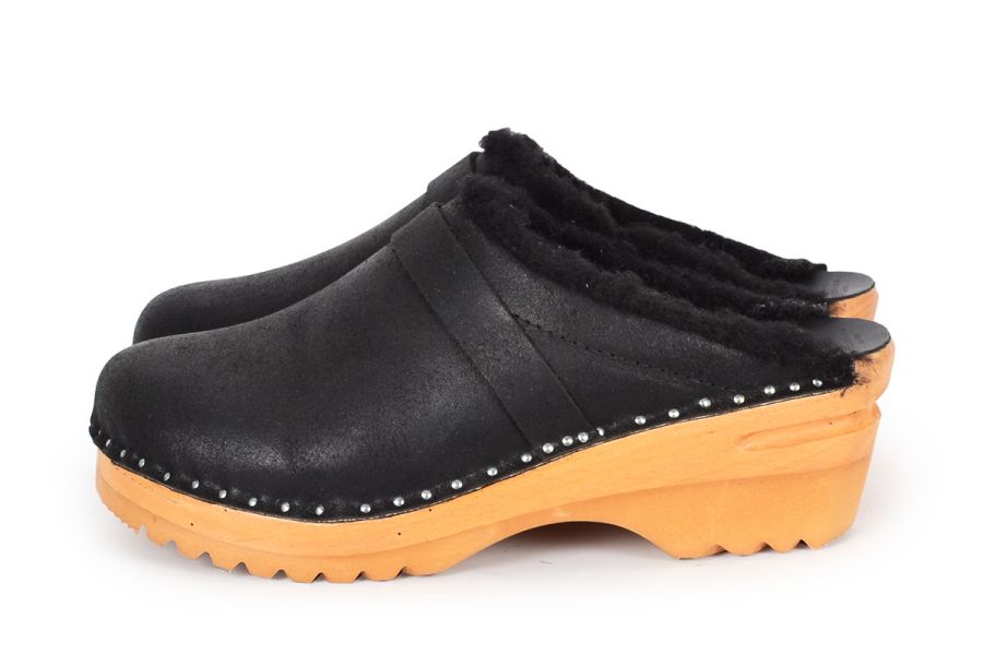 Wooden clog with warm wool lining for fall and winter wear, made on a varnished Ideal wooden clog bottom. The wooden footbed is developed to give support for the arch and an even weight distribution across the foot.