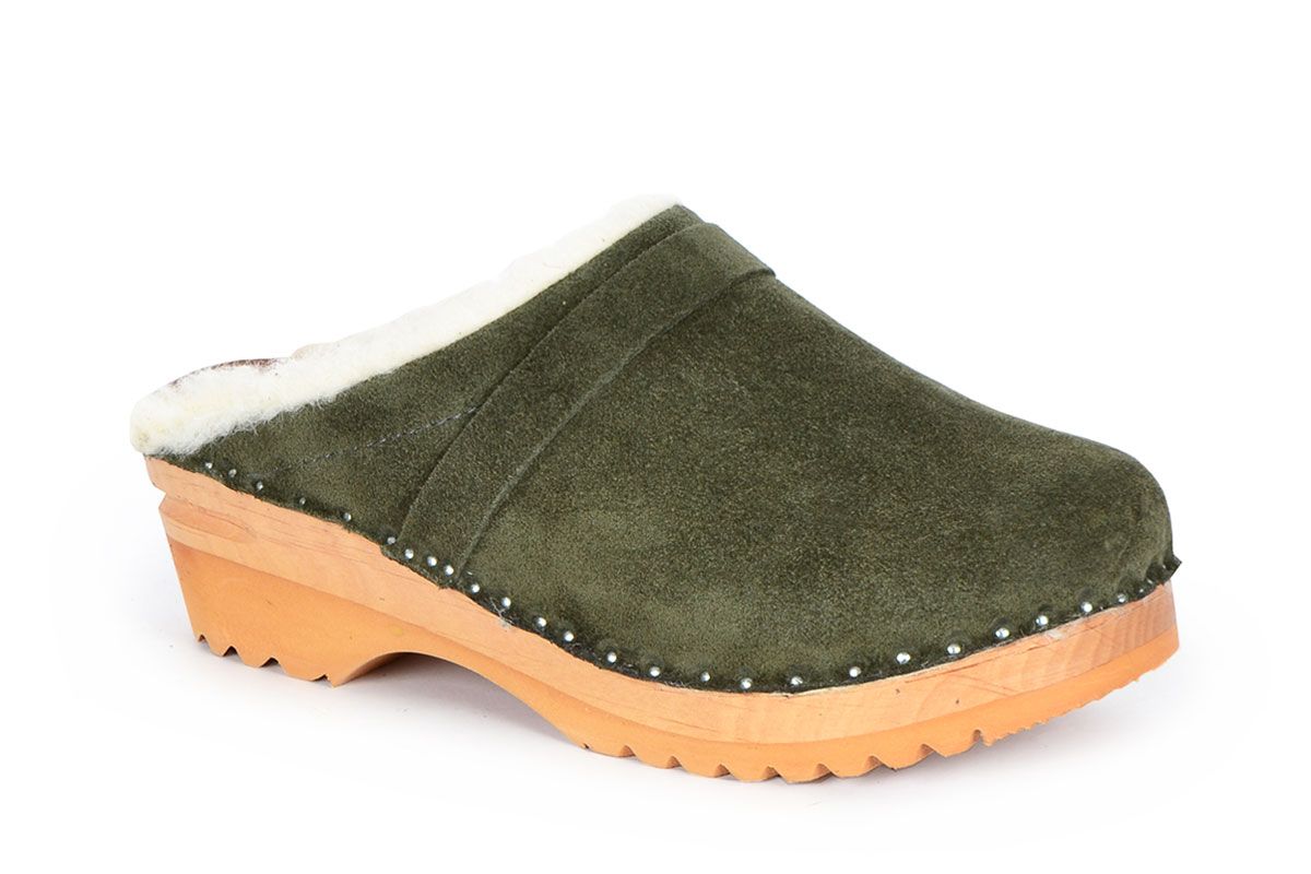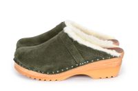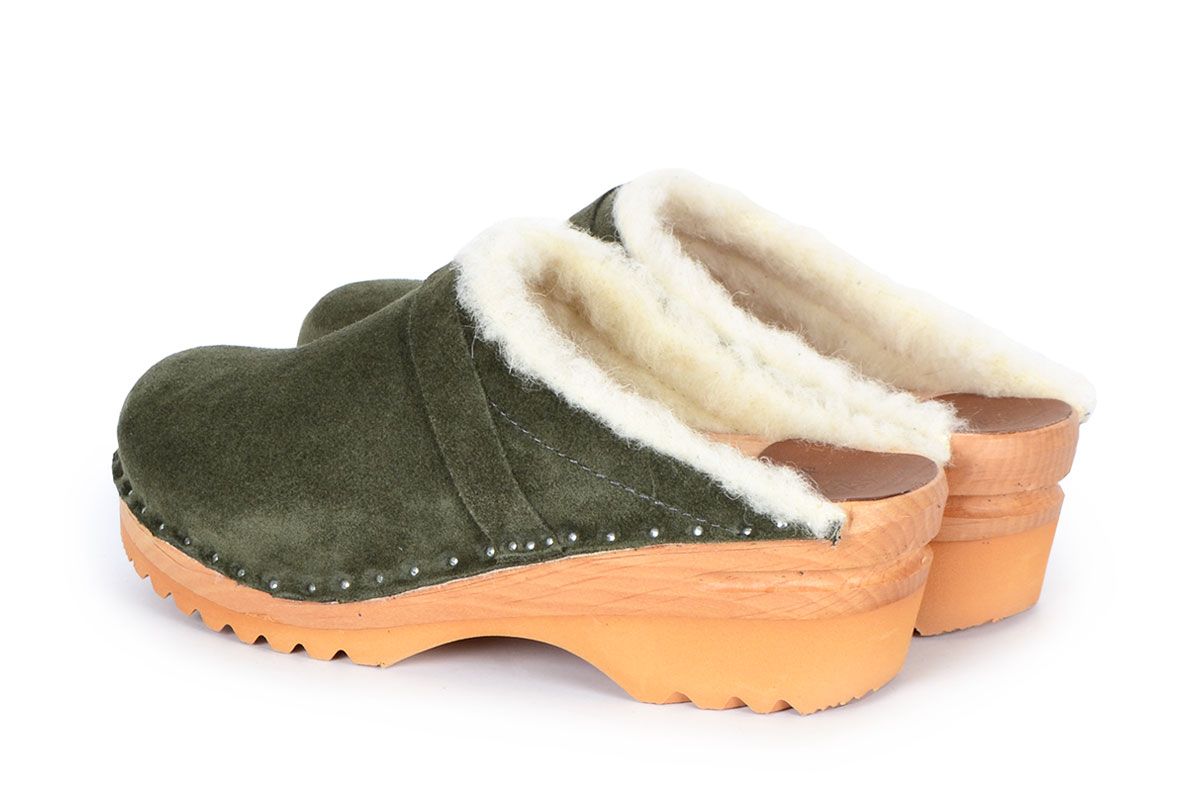 Wooden clog with warm wool lining for fall and winter wear, made on a varnished Ideal wooden clog bottom. The footbed is developed to give support for the arch and an even weight distribution across the foot.