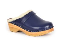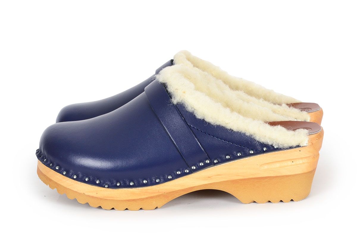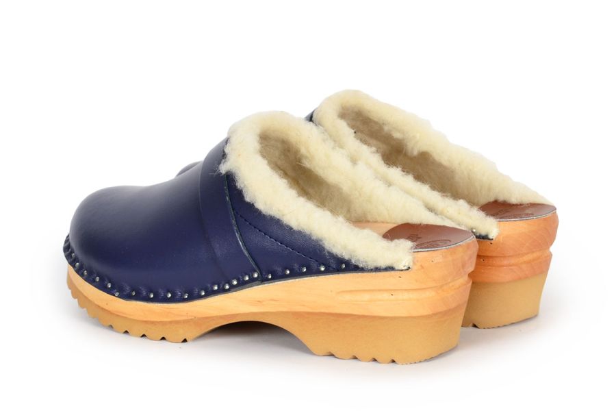 Wooden clog with warm wool lining for fall and winter wear, made on a varnished Ideal wooden clog bottom. The footbed is developed to give support for the arch and an even weight distribution across the foot.