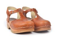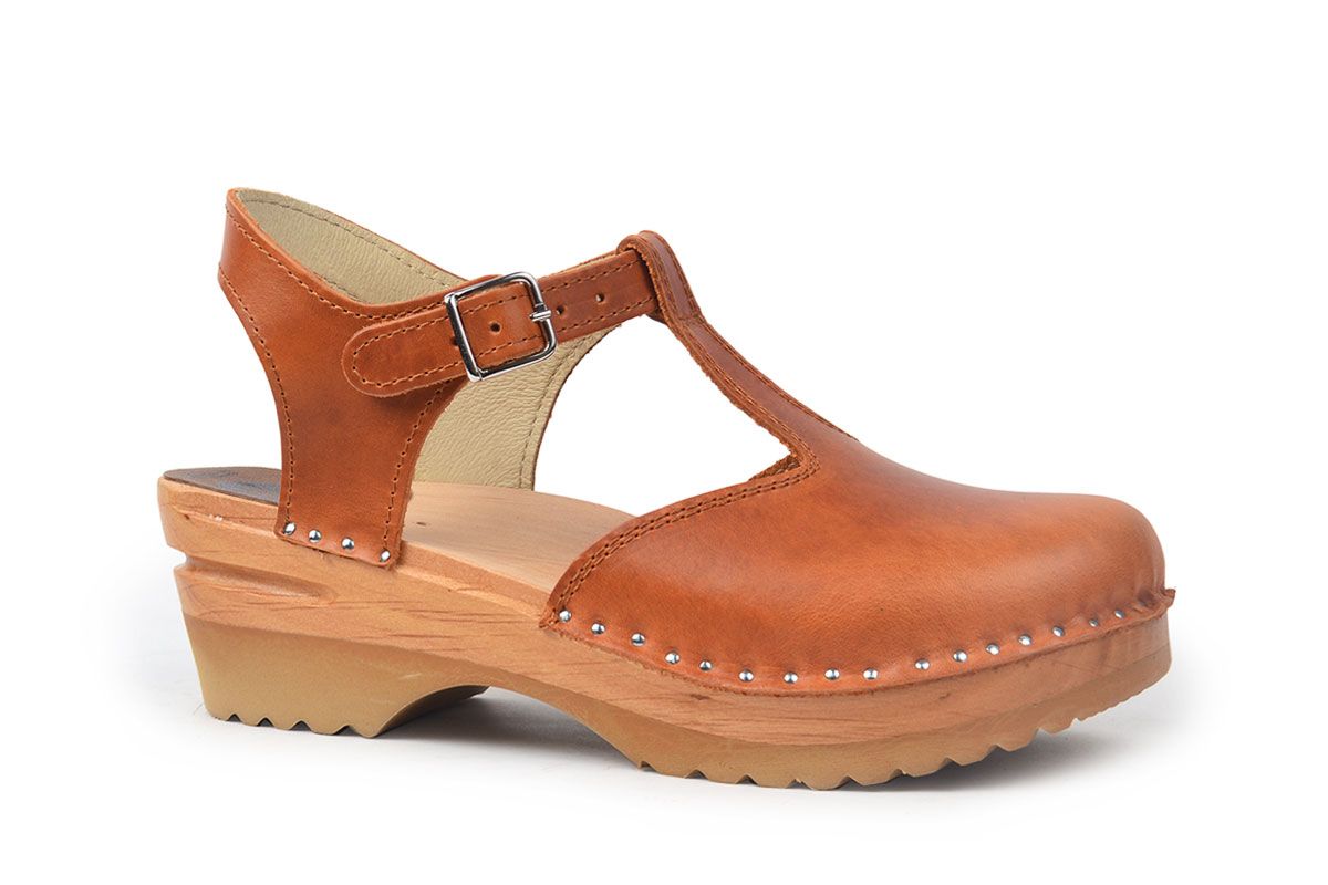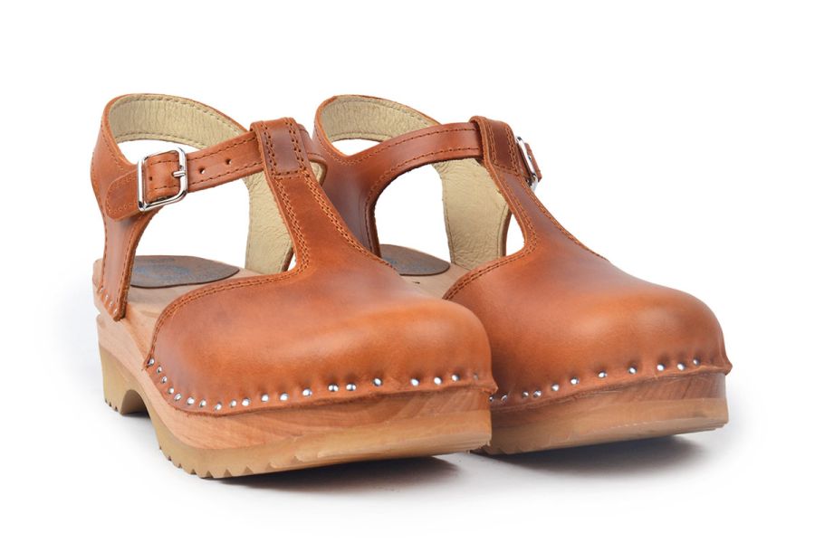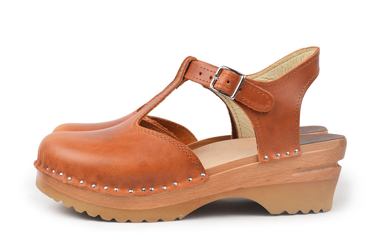 Clog sandal in cognac pull up leather with an adjustable ankle strap, made on our natural Ideal wooden bottoms.