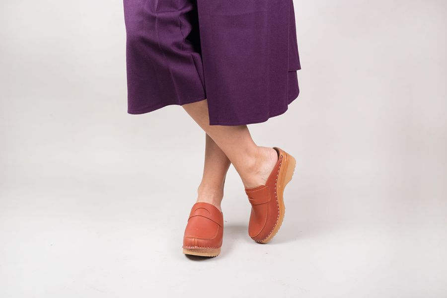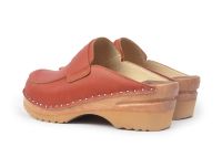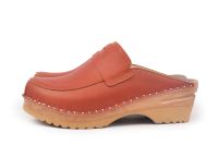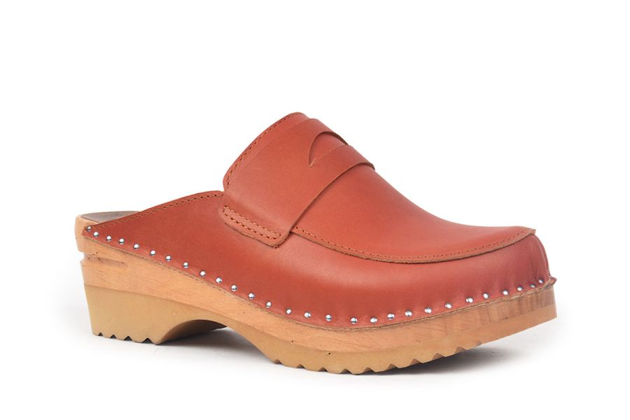 Pollock is a classic penny loafer clog style, here made in sienna waterproof leather with soft leather lining and nailed on our varnished Ideal wooden clog bottom.