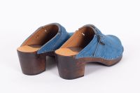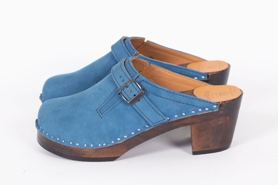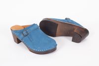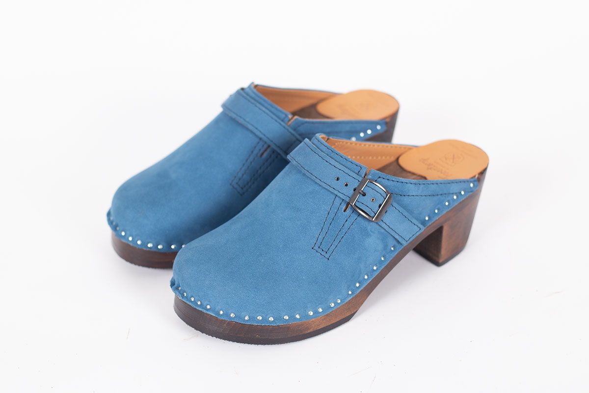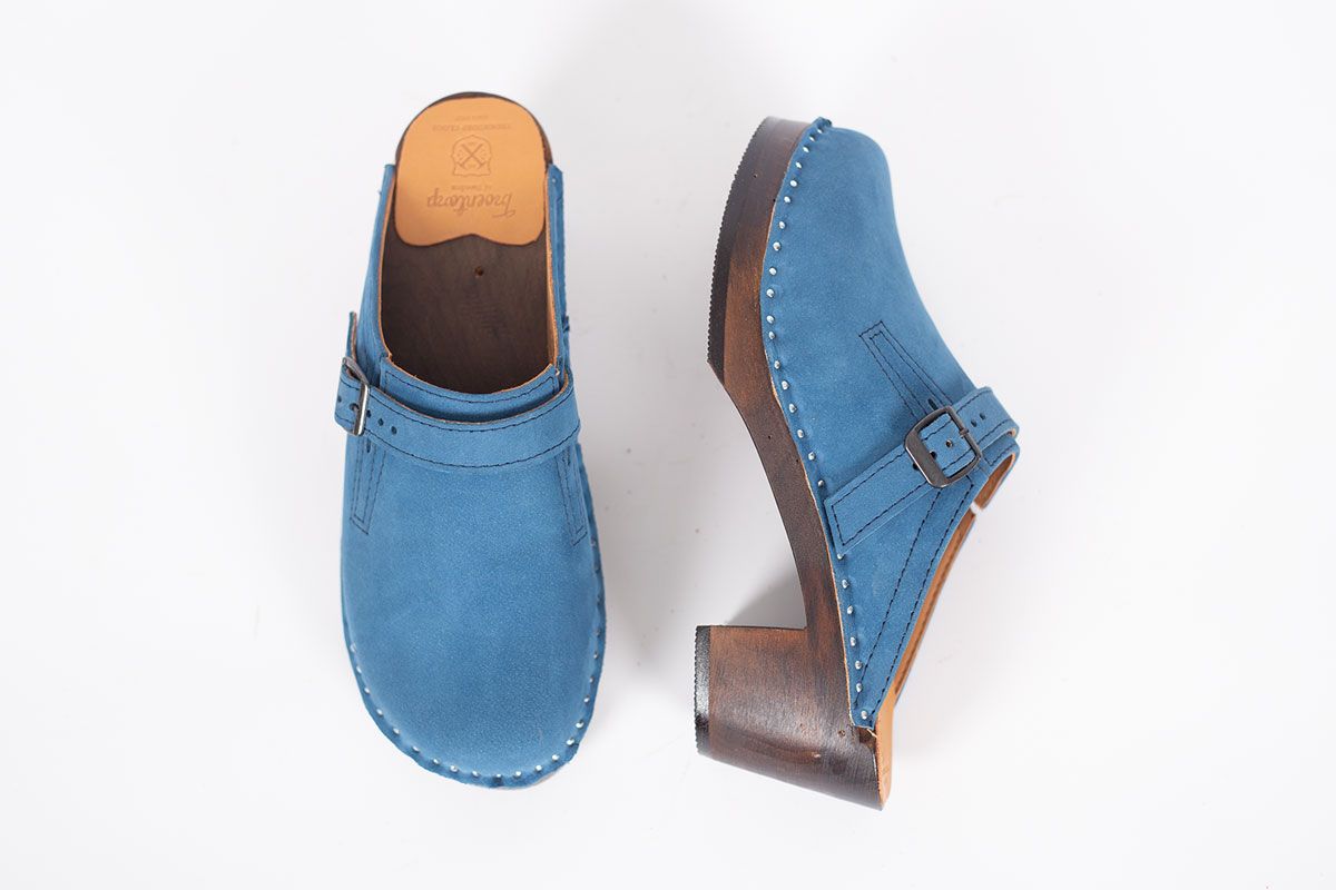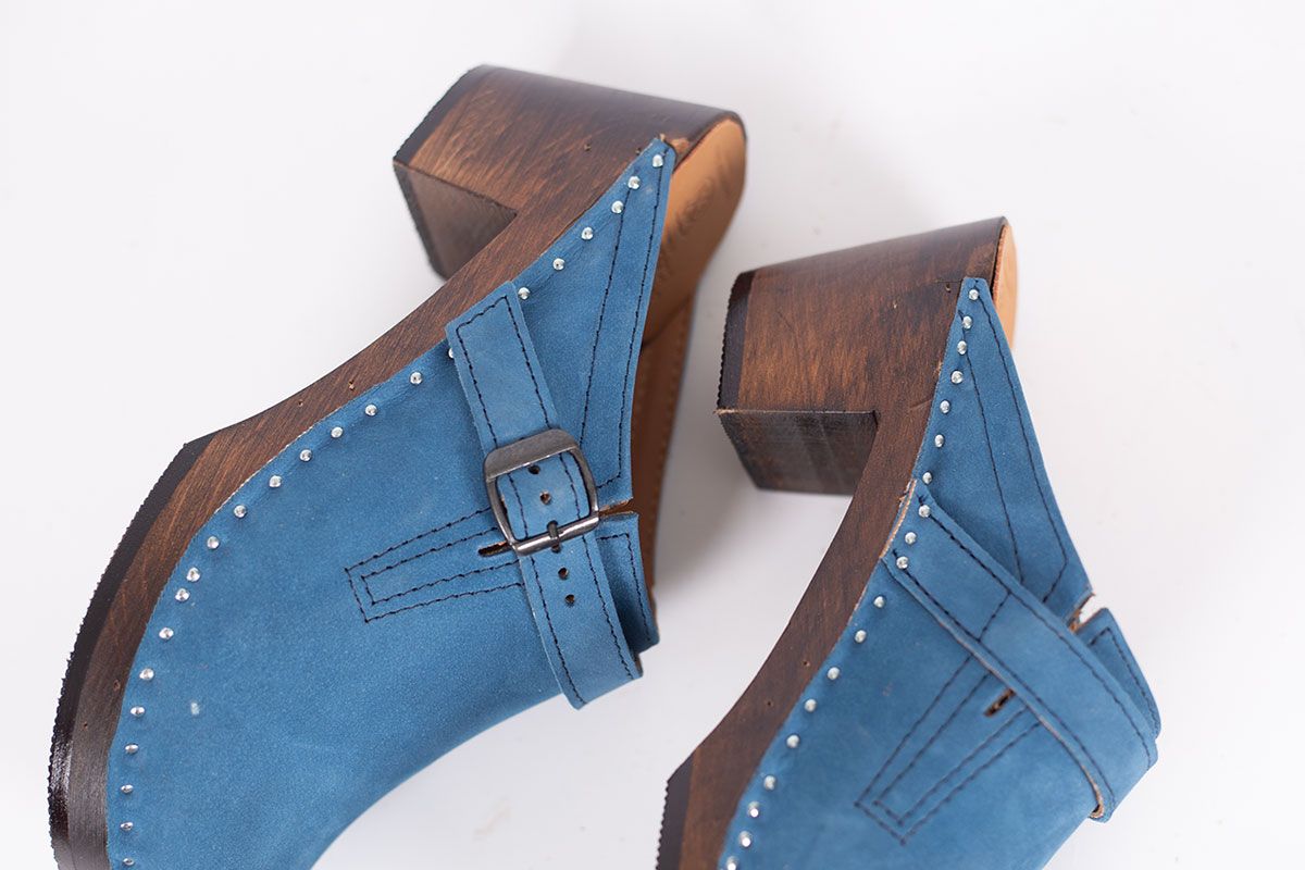 Raphael was designed in 1962 and comes with an adjustable strap over the instep. The clogs are made in blue nubuck leather and nailed onto our varnished brown Mid heels.