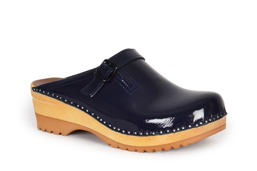 Raphael is a classic Swedish clog style designed in 1962. The model comes with and adjustable strap over the instep in blue leather, nailed on a varnished wooden clog bottom.
