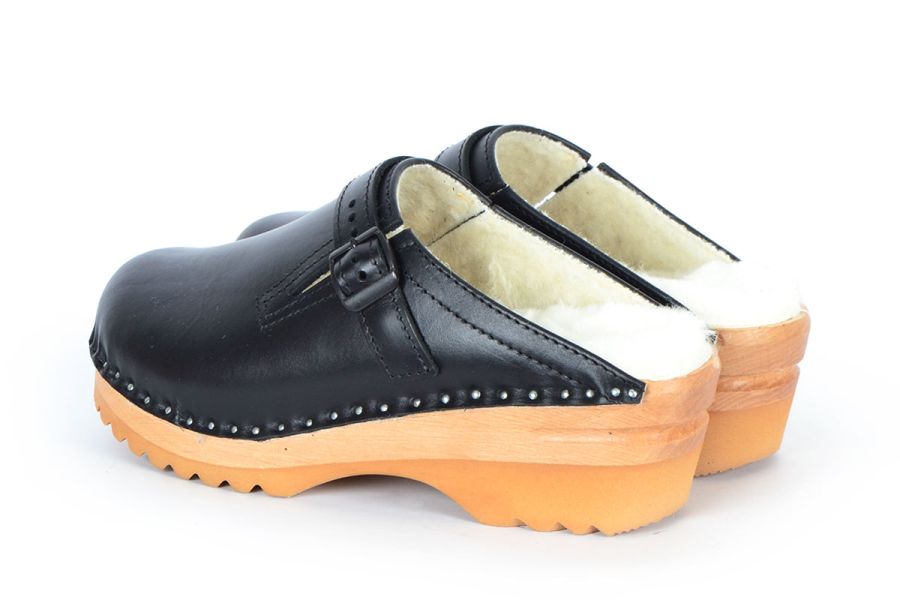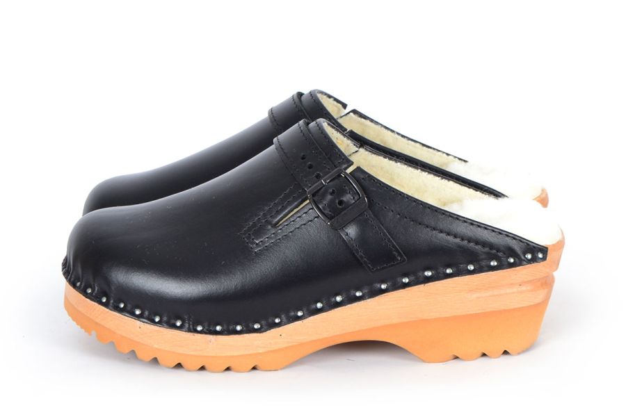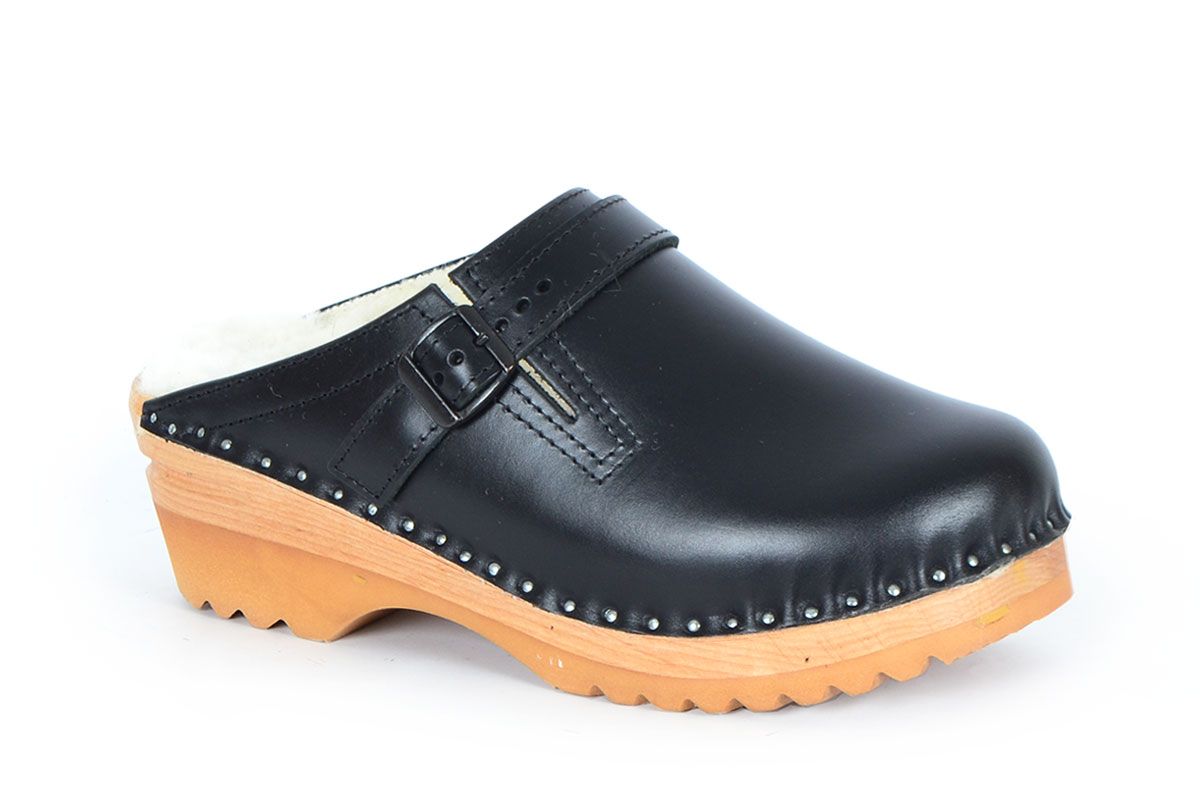 Raphael was designed in 1962 but we have now added warm lining to this classic. The model comes with and adjustable strap over the instep with an upper in black leather, nailed on a varnished Ideal bottom, with a wool lined upper and shearling footbed.