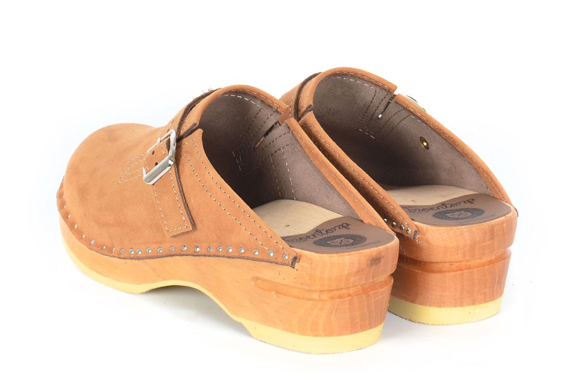 Raphael was designed in 1962 and comes with an adjustable strap over the instep. The clogs are made on our varnished Original bottoms.