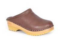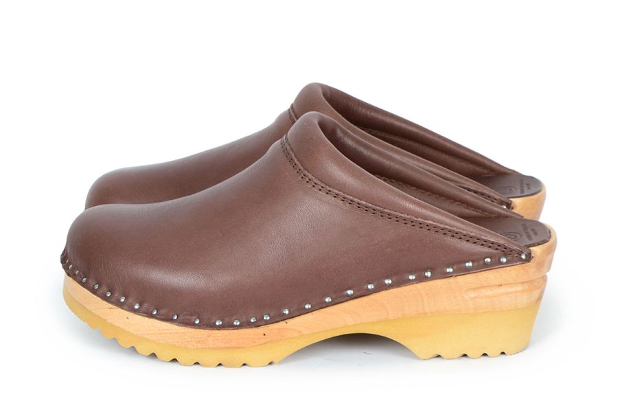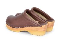 Clean Swedish clog design in brown vegetable tanned leather with beige chrome free lining leather and a padded instep. Made on our varnished Ideal wooden clog bottoms.