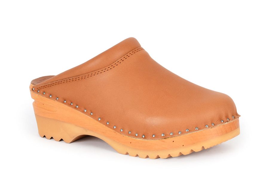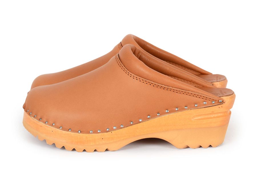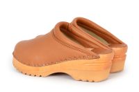 Rembrandt has a clean design with soft padding over the instep for comfort and extra stability. Here in soft light brown vegetable tanned leather on our varnished Ideal wooden clog bottom. This natural leather will age with a beautiful rich patina, giving a distinctive look to every pair of clogs. A protective coating has been applied to make it less sensitive, but as with all vegetable tanned leathers, it is best to to try and avoid exposure to water and other liquids.