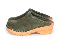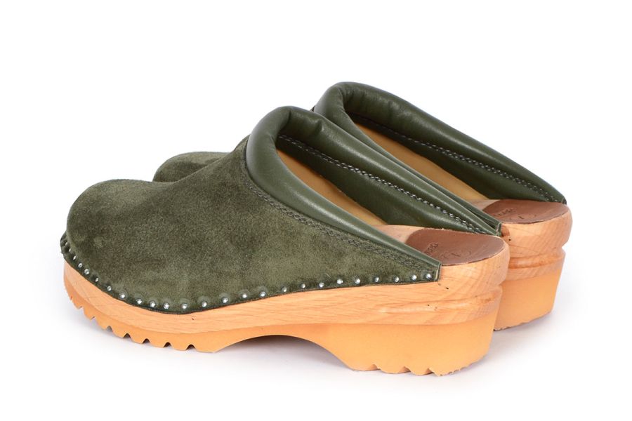 Clean Swedish clog design in moss green oily suede with a padded instep in matching nappa leather. Made on our varnished Ideal bottoms.