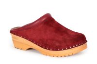 Clean Swedish clog design in scarlet red oily suede with a padded instep in matching nappa leather. Made on our varnished wooden Ideal soles.