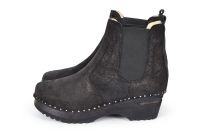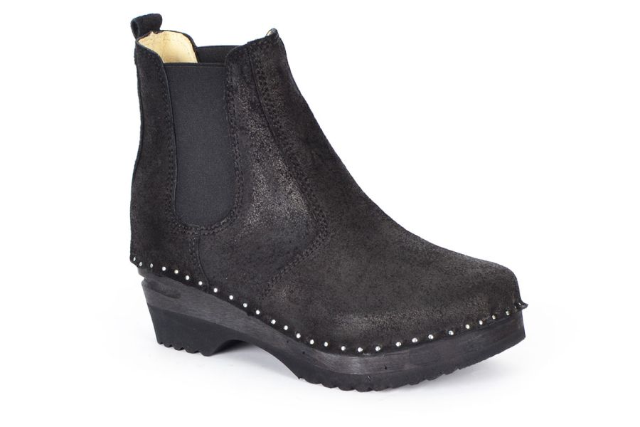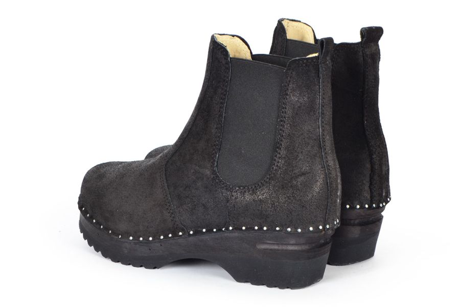 Chelsea clog boot with elastic on the sides in black waxy suede leather. Nailed onto our black Ideal soles.